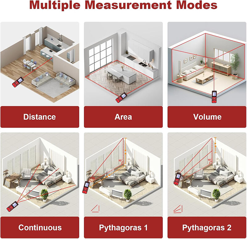 High Accuracy: Equipped with Class Ⅱ laser technology (630-650nm, p<1mW), this laser distance meter achieves ±2 mm accuracy and supports measuring distances from 0.05m to 80m. It also features electronic angle measurement (±90°) for more flexible positioning