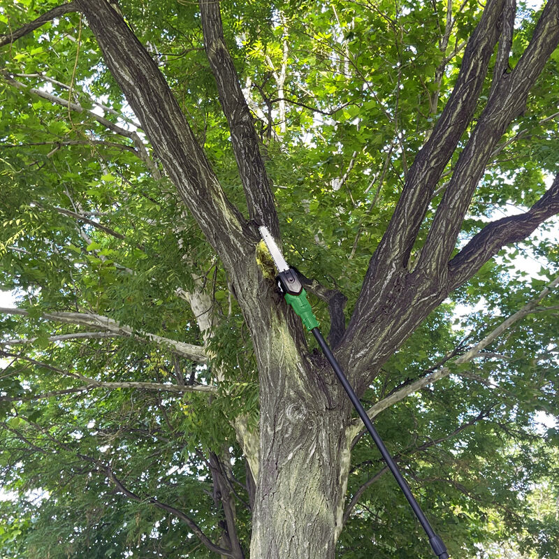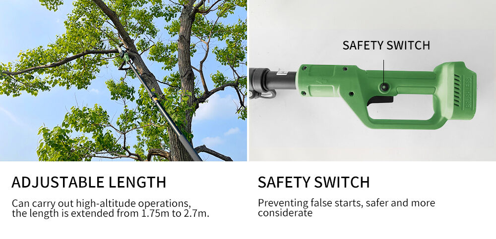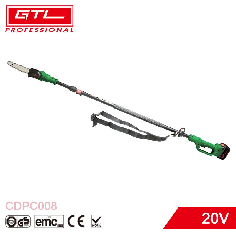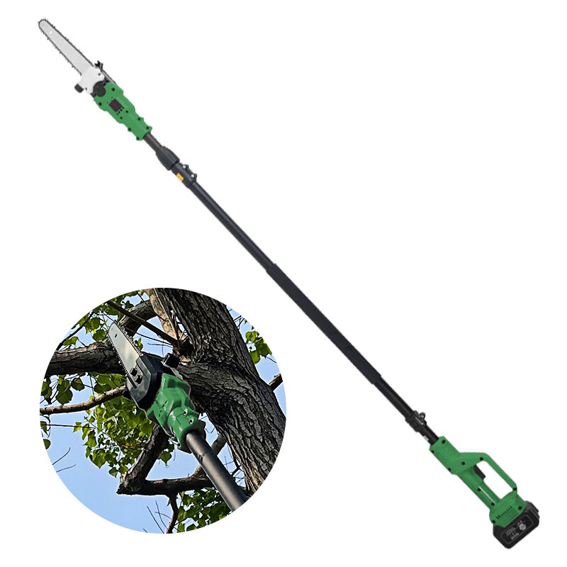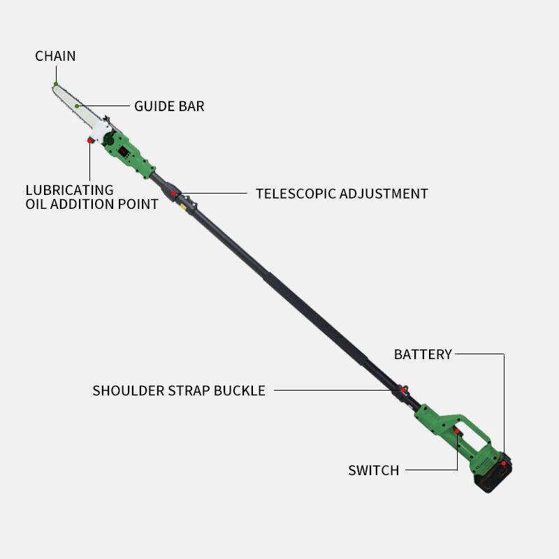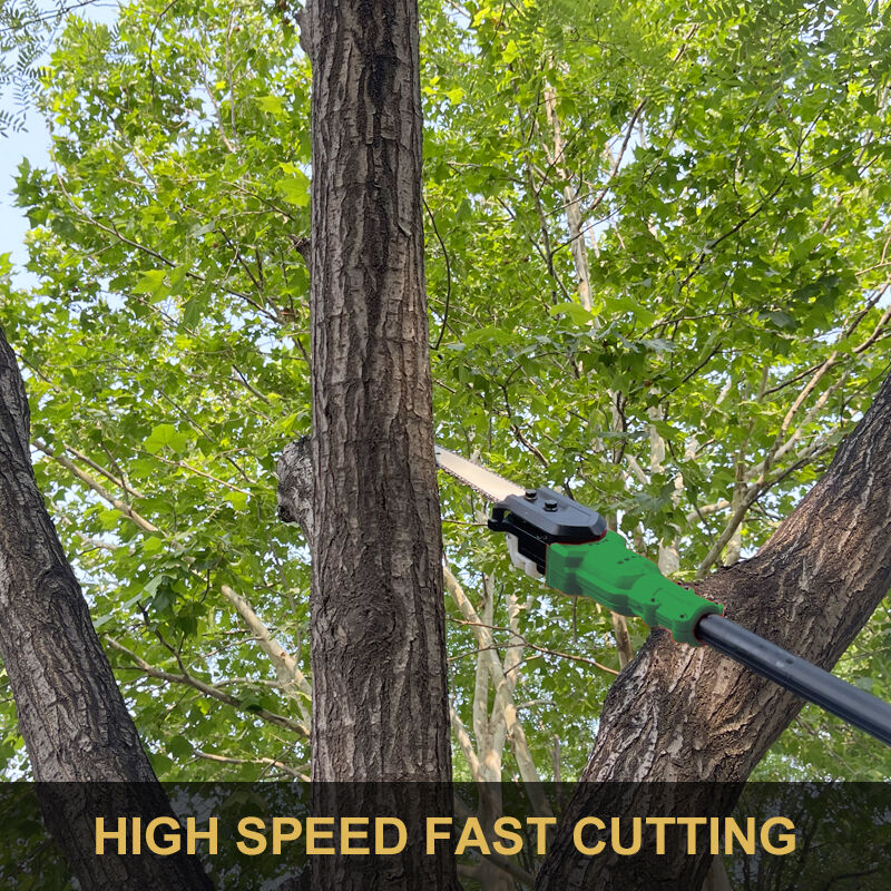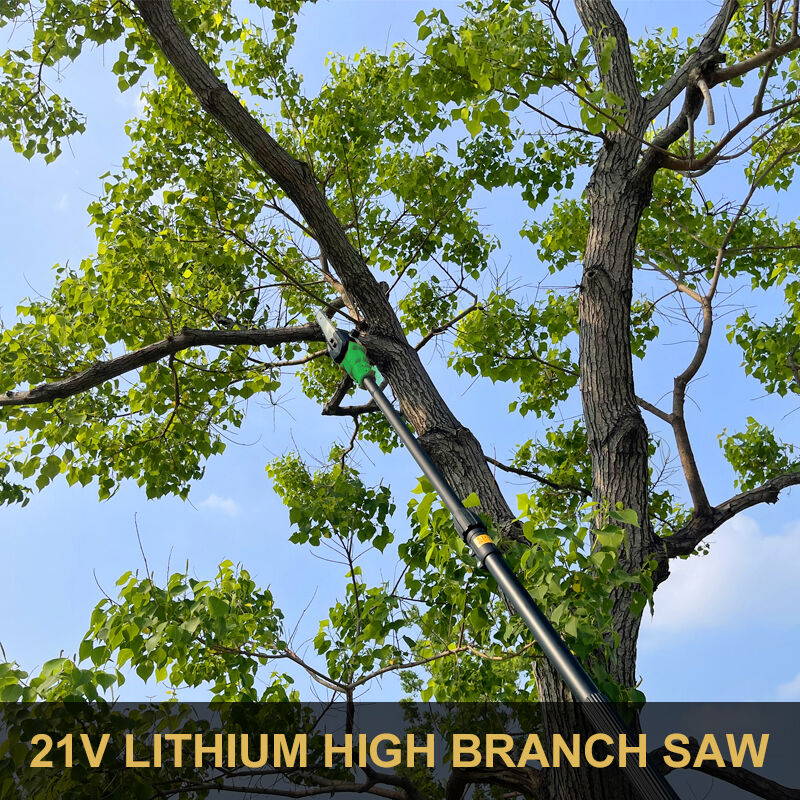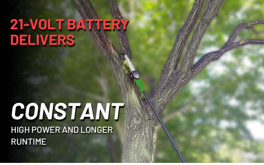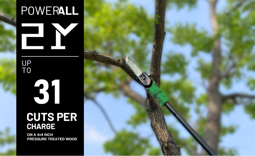 The cordless pole chain saw is a high-speed, lightweight, and ergonomically designed tool with an automatic lubrication system and adjustable length capability, featuring a 21-volt battery for extended runtime and high-efficiency cutting performance on various materials.