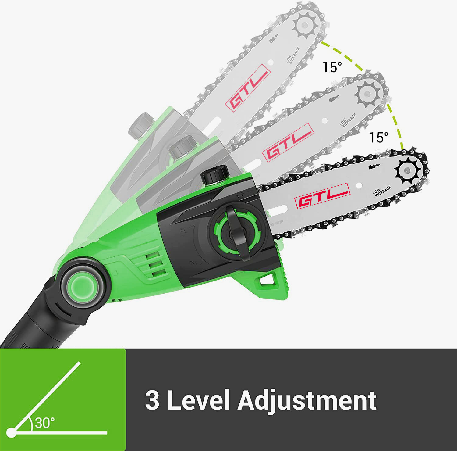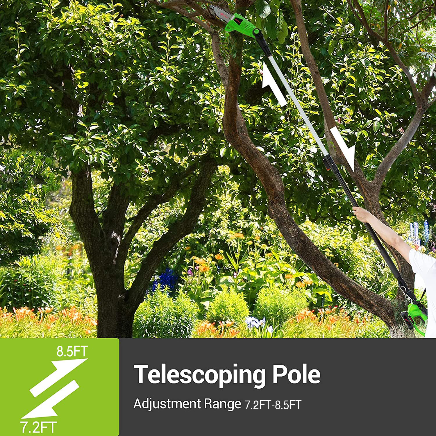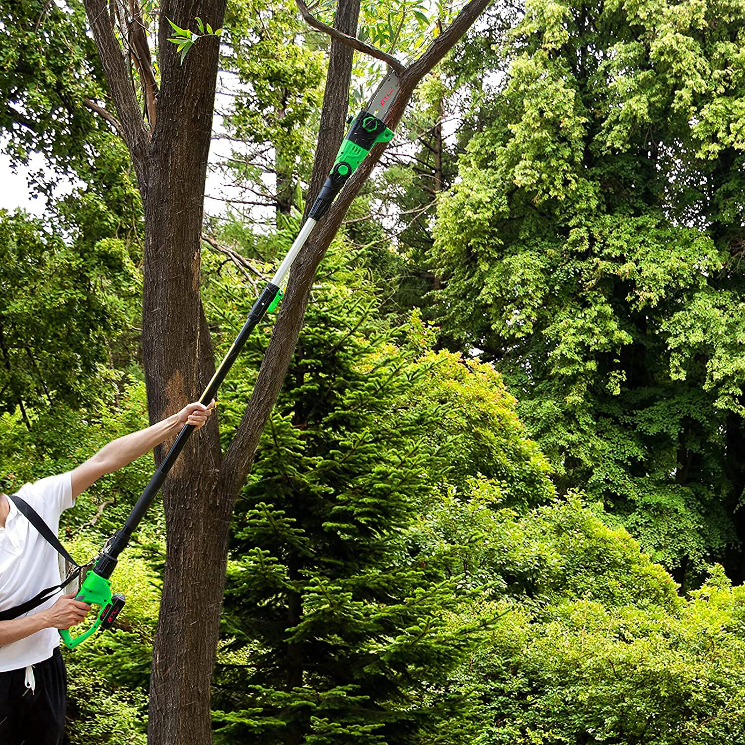 Telescopic pole & Shoulder Strap: Reach new heights with the extendable pole that provides up to 8.5 feet of overhead reach. A shoulder strap reduces fatigue from carrying the pole chainsaw trimmer while providing added comfort, balance, control, and stability during pruning.