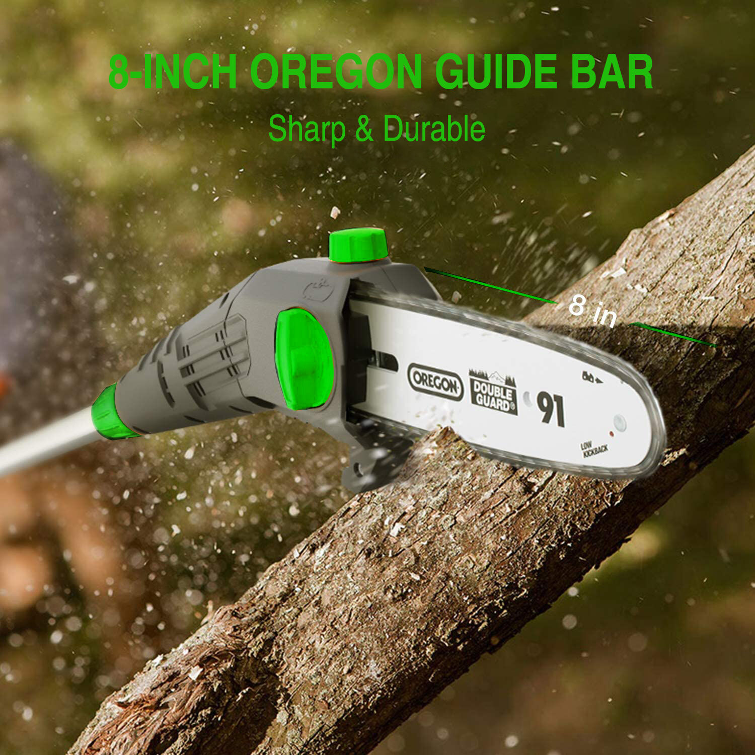 Powerful Cutting Performance: Replaceable 8-inch Oregon cutting bar and chain allow easy trimming of branches. Our pole chain saw offers a cutting speed of 5.5 m/s that gives fast, clean overhead cutting.