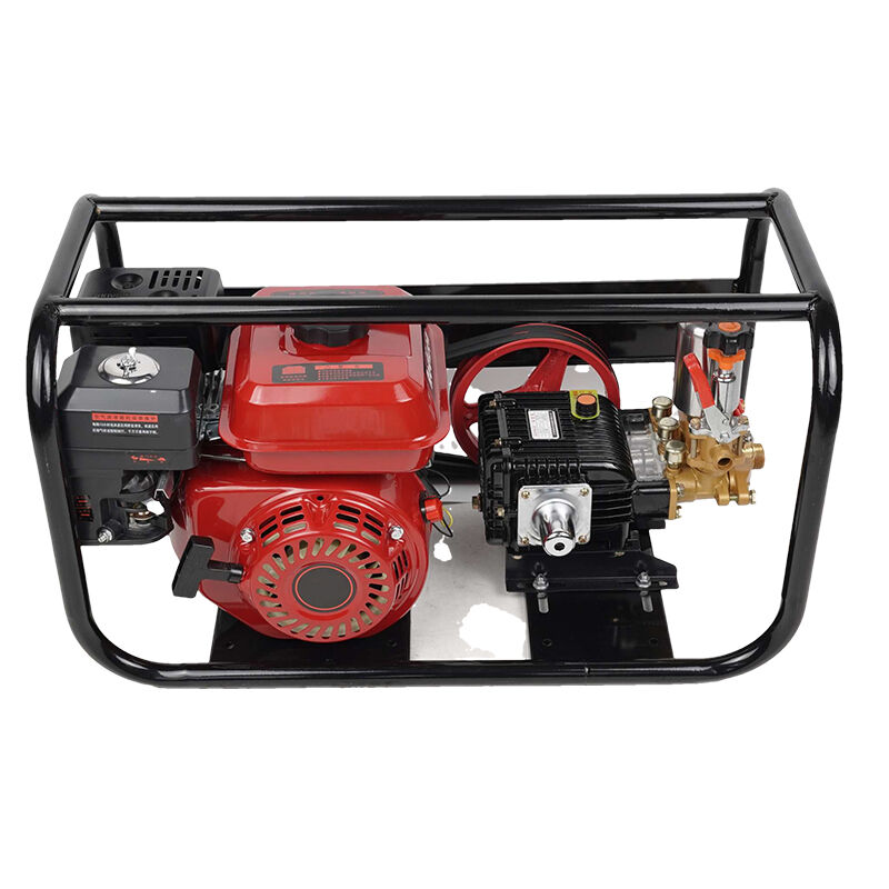 This gasoline-powered pressuresprayer is equipped with a 196cc 1-cylinder 4-stroke air-cooled OHV engine, delivering 6.5HP max power. It features 3×30mm plungers, 30-40L/min suction volume, and 2.5-4.0Mpa working pressure, making it ideal for heavy-duty cleaning tasks requiring strong water flow and pressure.
