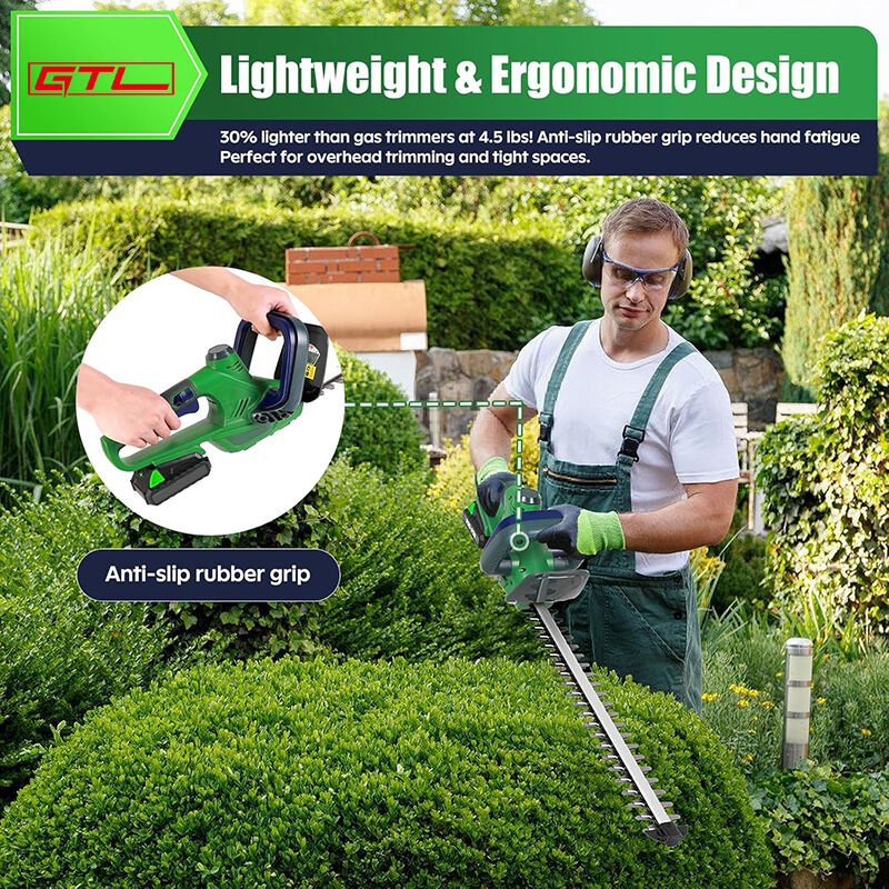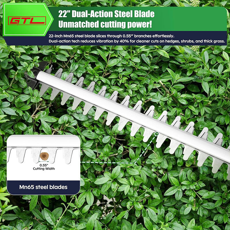 Key Features: 22-inch Mn65 steel blade slices through 0.55-inch branches effortlessly. Dual-action tech reduces vibration for cleaner cuts on hedges, shrubs and thick grass; Light at 4.5 lbs. Anti-slip rubber grip reduces hand fatigue, perfect for overhead trimming and tight spaces; Power meets backyard needs. Faster with double cutting speed, no more struggling with dull blade or weak motor.