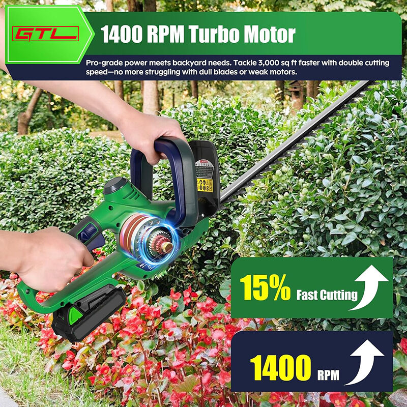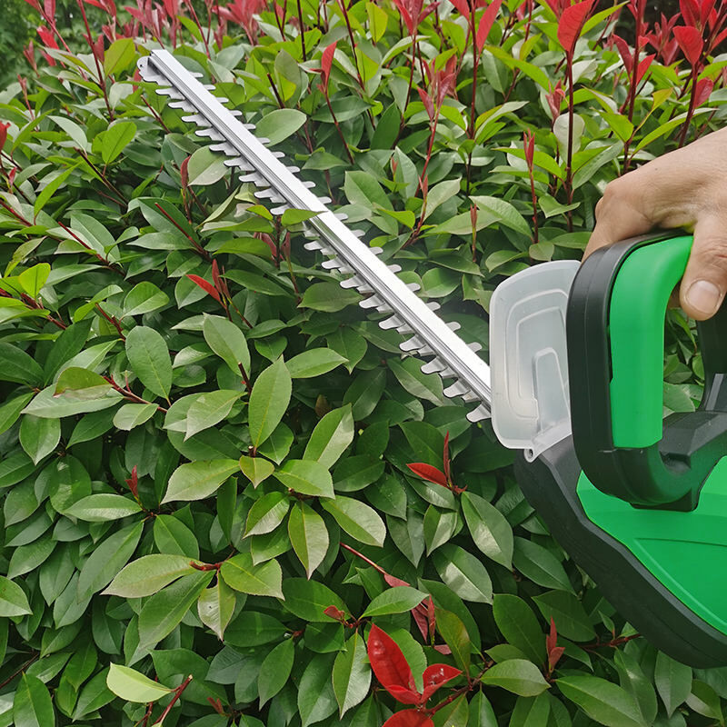 Equipped with a 560# brush motor that operates at 1400rpm no-load speed, it ensures smooth and precise cuts through various hedge materials, while the 65MN blade material offers durability and sharpness retention; featuring an electronic brake for enhanced safety and an aluminum blade cover for added protection during storage and transport.