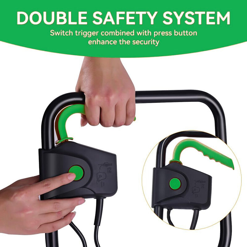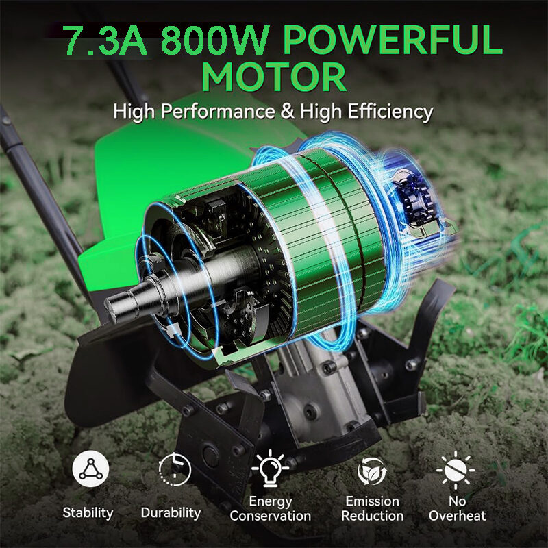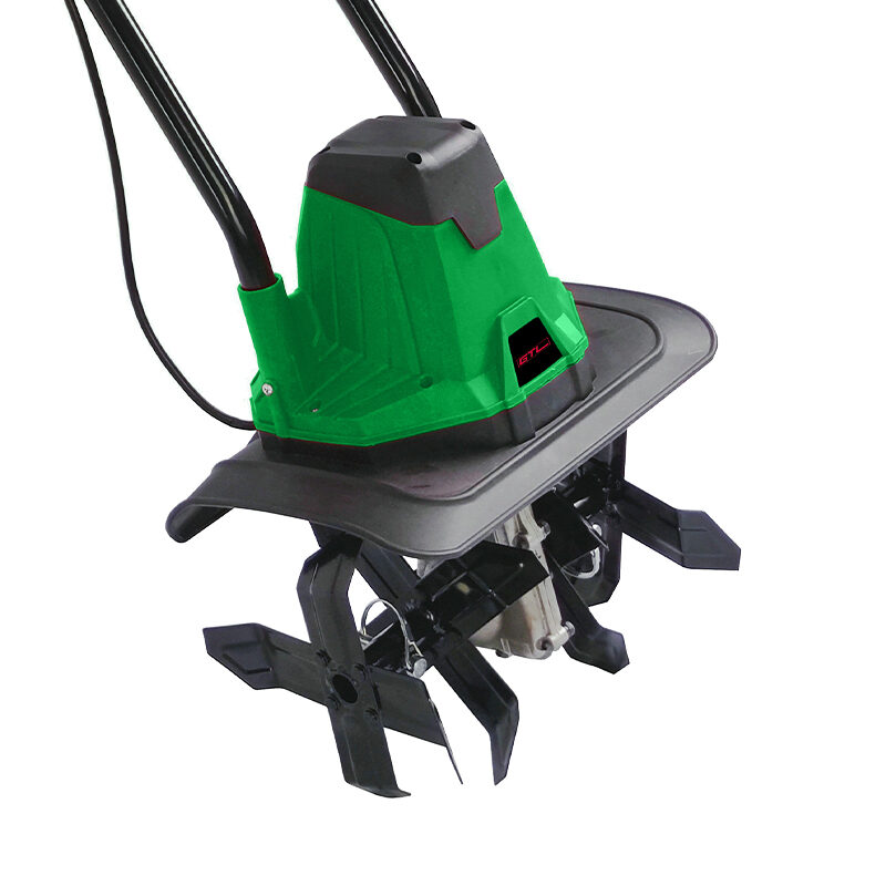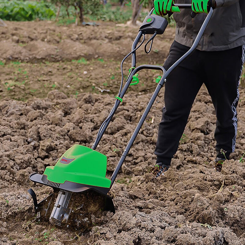 The electric tiller is equipped with a mechanical overload protection system. If the garden cultivator gets blocked by a foreign object, it will automatically turn off.