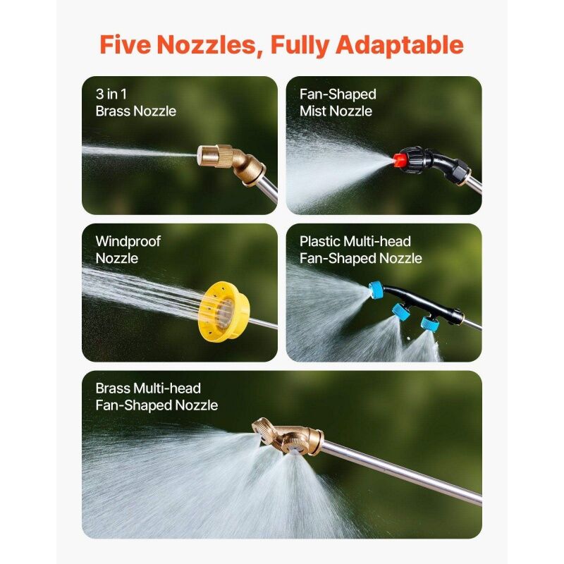 Versatile nozzles: Equipped with two-hand, four-hole, single, and 12D brass nozzles to adapt to different spraying scenarios.