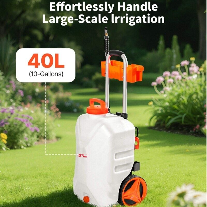 This Trolley Battery Sprayer is a high-performance tool ideal for diverse spraying tasks. It features a 40L large tank, 18V 4AH Makita lithium battery, and an automatic pump with 4.1/8.0 LPM flow rate for efficient, long-lasting use. The 15-meter pipe and 228mm wheels ensure flexible movement and extended reach. Equipped with four versatile nozzles (two-hand, four-hole, single, 12D brass) and a 30C-1 lance, it adapts to various needs. The 59A handle switch enables easy operation, making it perfect for gardening, agriculture, and disinfection.