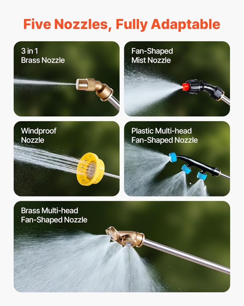 Versatile Nozzle Options : Equipped with four nozzle types (two-hand, four-hole, single, brass 12D) to adapt to diverse spraying needs.