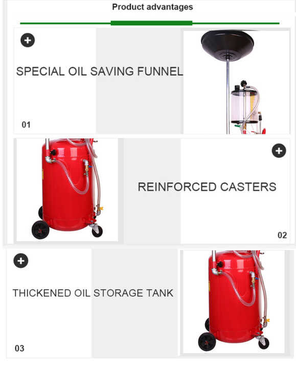 Secondary container:Easily transfers the used oil from the 68L tank to your own secondary container for recycling.