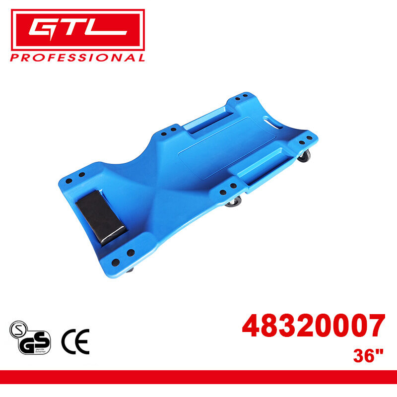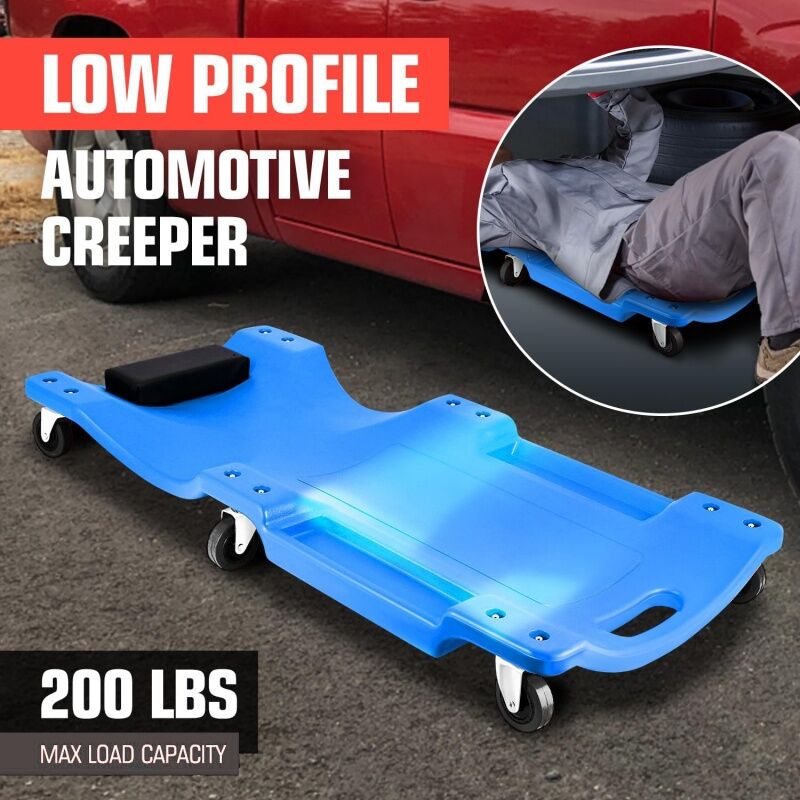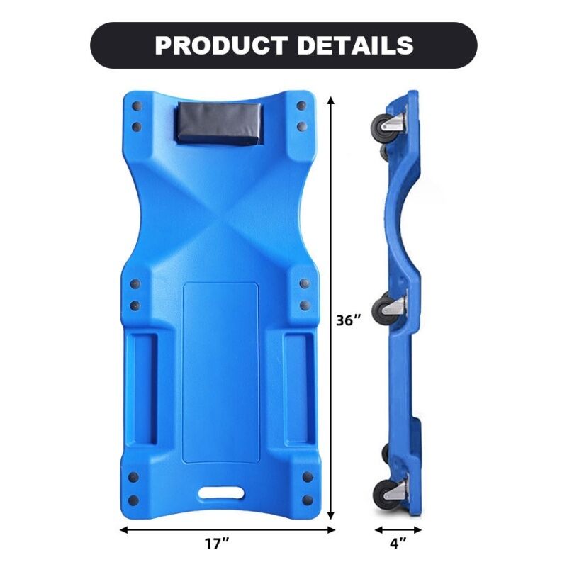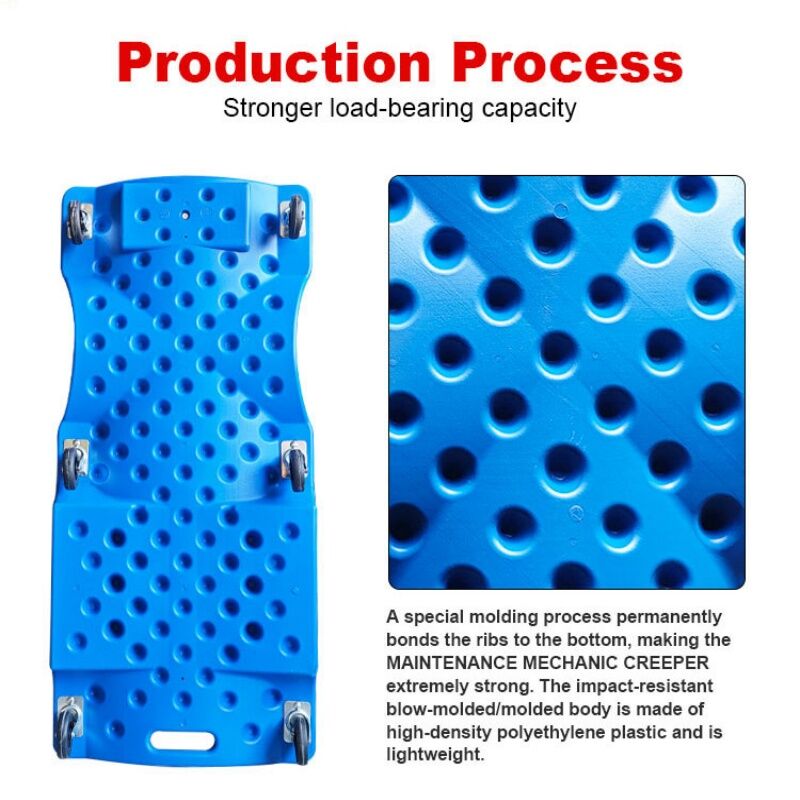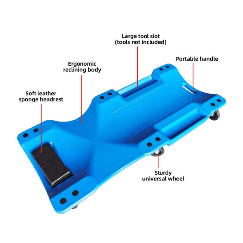 This Plastic Creeper features an ergonomic design with a shoulder recess and padded headrest for comfort. It supports up to 200 lbs, comes with a socket tool for easy assembly, and has side pockets. Made of high-density polyethylene, it's lightweight (9 lbs), strong, impact-resistant, and portable with a handle, ideal for garages and workshops.