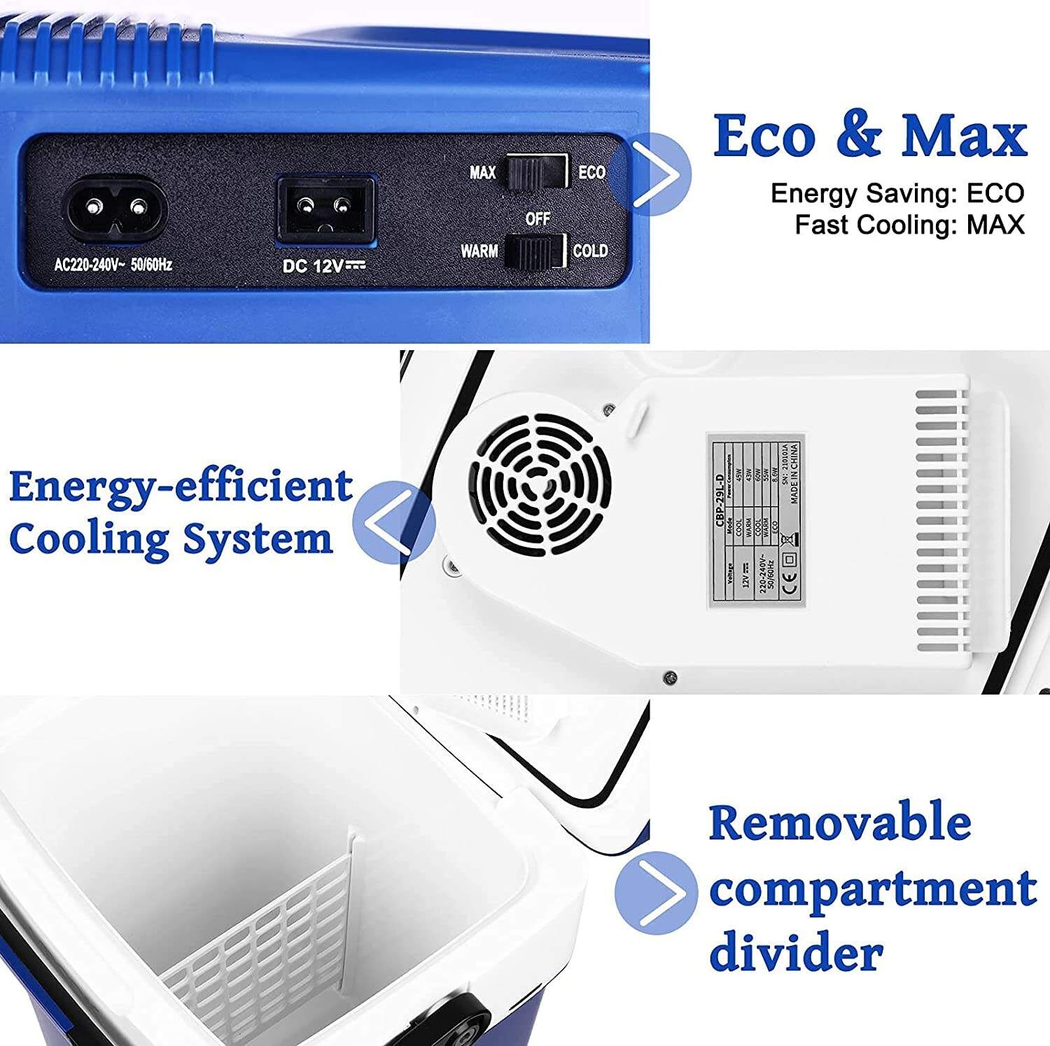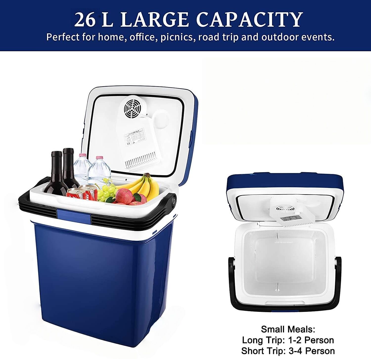 This thermoelectric cooler and warmer is a versatile companion, featuring dual cooling (13-18ºC below 25ºC ambient) and heating (50-65ºC via thermostat) to keep drinks cool or food warm. Powered by DC 12V (2m cable) for car/office use, it has a 26L spacious capacity and low 48W±10% power consumption-energy-efficient, practical for trips or daily needs.