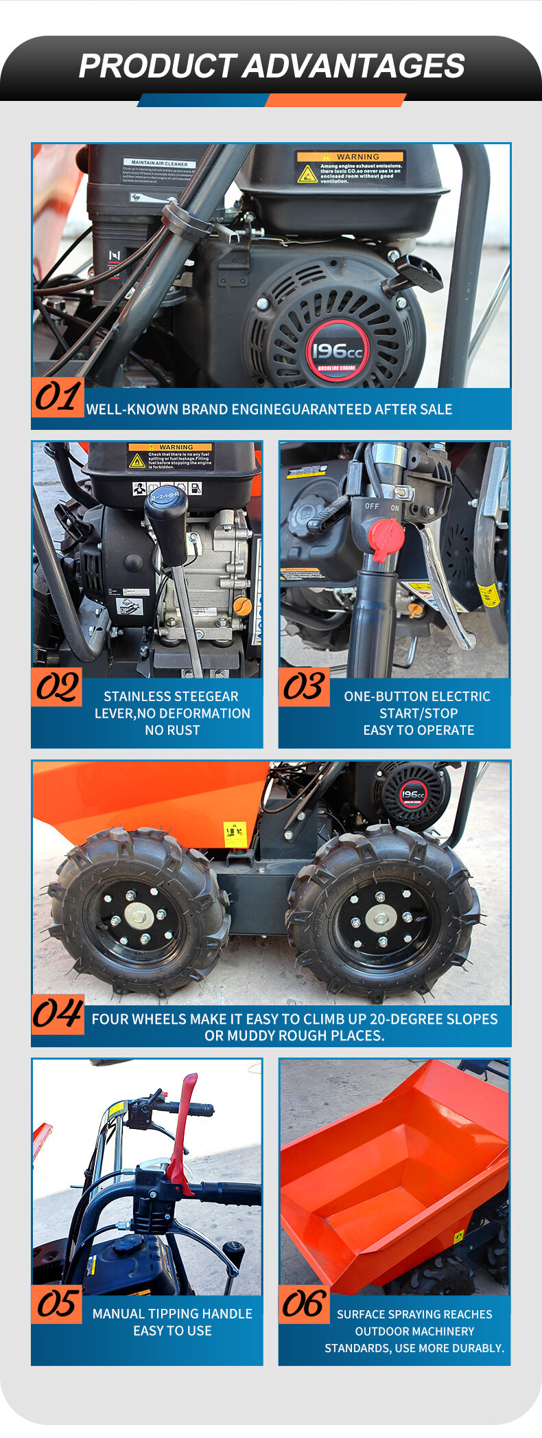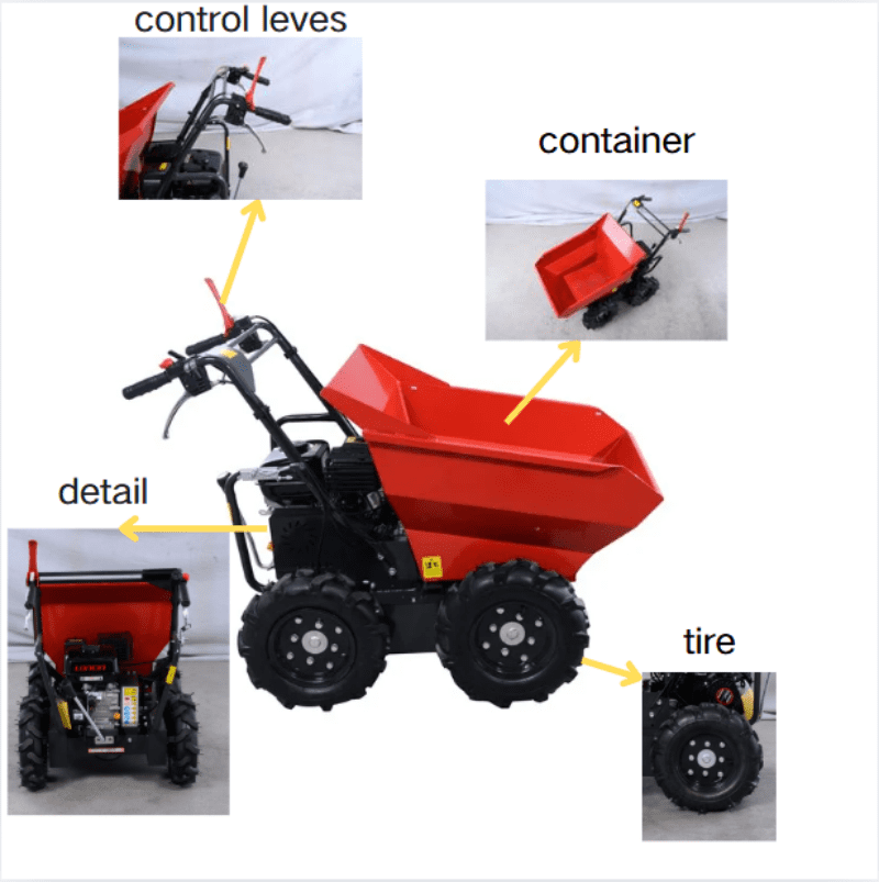 The Mini Dumper features a powerful 6.5HP OHV engine for reliable performance. With a 250kg load capacity and robust wheels for excellent stability, it handles heavy materials on rough terrain. Its compact design and 3-speed gearbox allow easy maneuvering in tight spaces, making it ideal for construction and landscaping tasks.