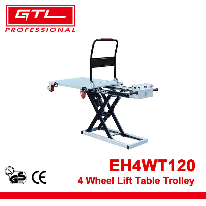 This Electric Hydraulic 4 Wheel Lift Table Trolley is ideal for material handling. It has a 1200*750mm platform, 300kg load capacity, and 1120mm elevation (900mm wheels-off-ground) for flexibility. With folded dimensions of 1400*750*330mm, it saves storage space. Powered by a 48V/12AH lithium battery (50-100 cycles) and 300w motor, it runs reliably. Compatible with 220V/110V, it suits global use. Net weight 90kg, gross weight 110kg, balancing portability and sturdiness.