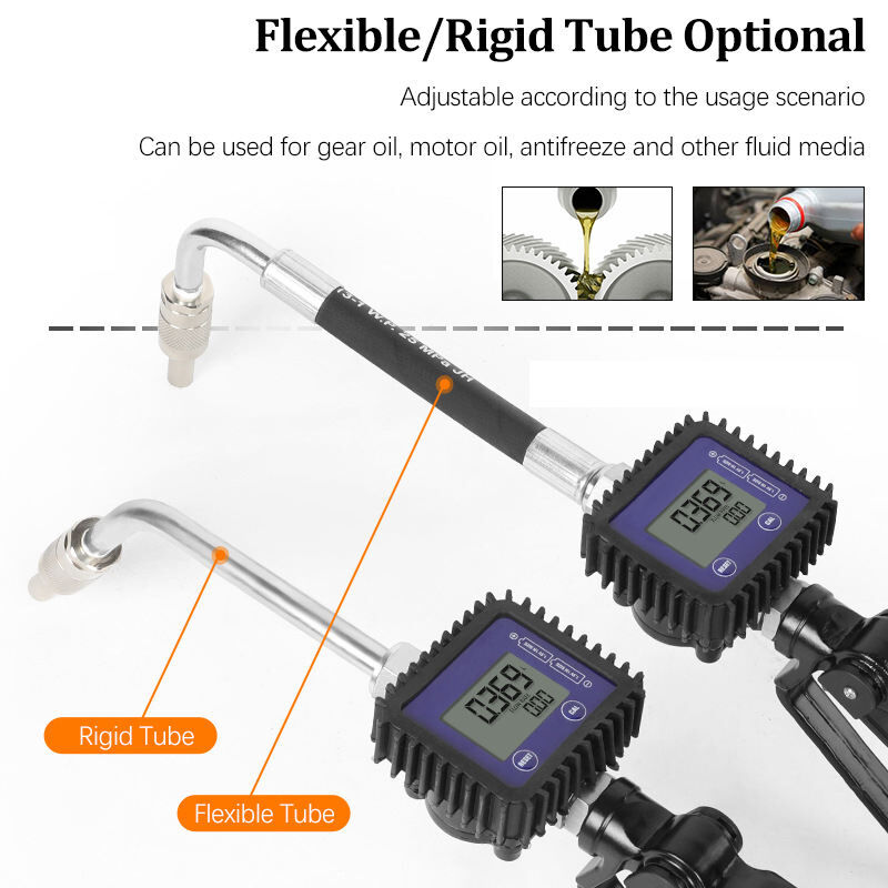 This digital oil control valve features flexible configurations (rigid tube/manual tip or flexible hose/semi-auto tip) for controlled fluid flow. Equipped with a 5-digit LCD (4 units: L/GAL/PT/QT) and intuitive buttons, it tracks single/total dispense volumes accurately. Boasting an ergonomic handle, durable aviation aluminum nozzle (anti-drip/leak), and low battery indicator, it's ideal for factories, gas stations-efficiently filling gear oil, engine oil, antifreeze, etc.