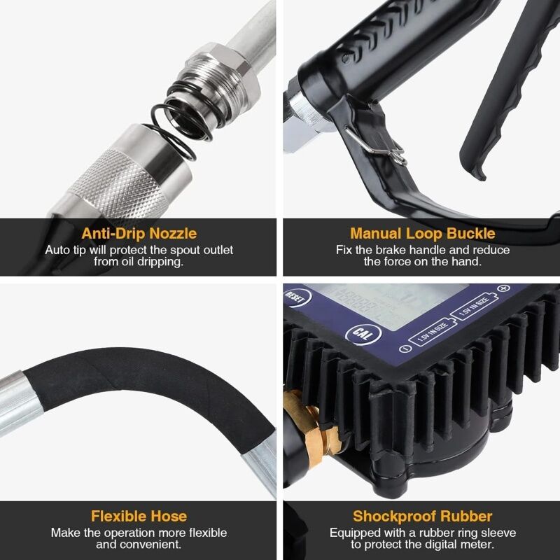 Humanized Design: LCD digital oil pump with ergonomic handle, more comfortable to hold.Aviation aluminum nozzle, durable. The muzzle is well designed to prevent oil dripping and leakage.