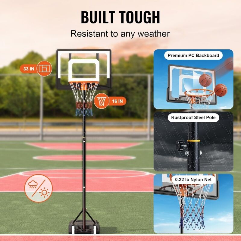 Resistant to Any Weather: Designed for both indoor and outdoor use, this basketball hoop & goal features a premium PC backboard, a durable 0.22 lb nylon net, and rustproof steel pole. These components ensure that the hoop remains resilient in the face of sun, rain, or snow, providing long-lasting performance and durability.