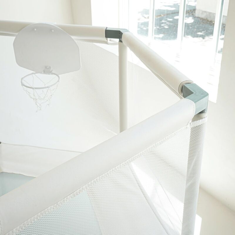 This kids' trampoline is perfectly sized for toddlers/children-compact for indoor/outdoor use, crafted from high-quality materials to hold up to 220 lbs. USA-designed with a sleek, aesthetic look that fits any playspace. It boosts balance, coordination, and motor skills, plus includes a hoop and basketball for extra sports fun. Safety-focused with a no-gap design, padded bars, safety net, and soft vegan leather frame padding, ensuring endless safe, active play for little ones.