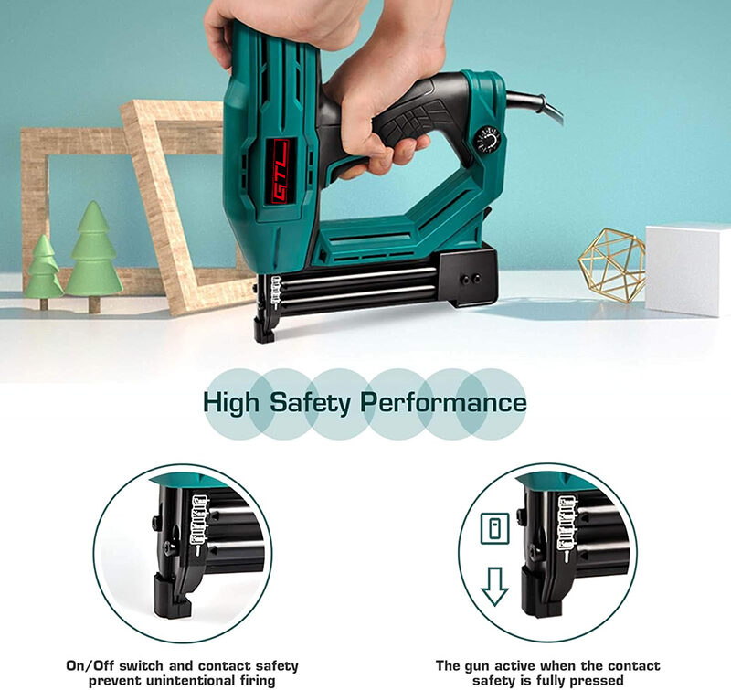 Safety First: Double protection brad nailer with on/off switch + safety contact—fires only when both are engaged for accident-free operation