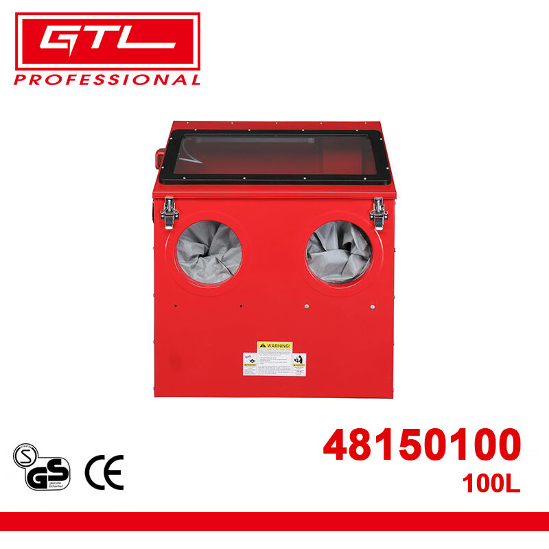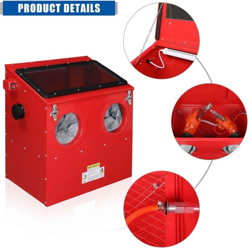 This professional-grade sandblasting cabinet is engineered for efficiency and power. Its large 100L capacity and 30 lb abrasive hopper support extended work sessions on substantial components. Designed for robust performance, it operates at up to 80 PSI with a 7 mm nozzle for fast, effective cleaning. Excellent visibility is guaranteed by the spacious viewing window and an integrated internal light. The cabinet features a thoughtfully designed workspace within a compact footprint and includes a dedicated 2-1/2" dust port to maintain a clean and safe working environment. Built for demanding applications, this machine combines high capacity with user-centric features for superior results.