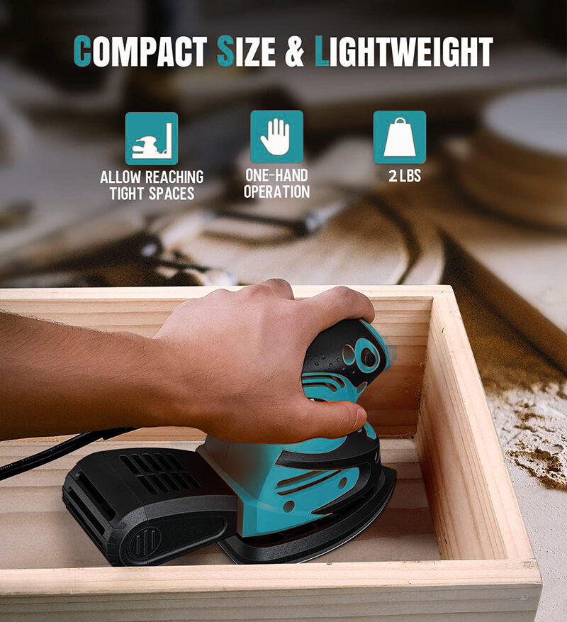 With a no-load speed of 12500 rpm, ensuring fast and smooth sanding on wood, metal, or plastic surfaces. Its compact 140×140×100mm pad size and mouse-like ergonomic shape allow easy access to narrow corners, edges, and tight spaces
