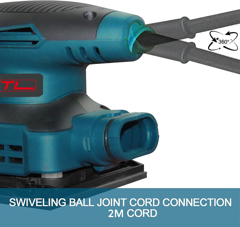 Cord&Swiveling Ball Joint Connection:2m power cord allows the extented reach,which is more convenient to move the sheet palm sander around when you doing woodworking.Ball joint connection for 360-degree rotation,reducing breakage to keep you safe and extend the tool life