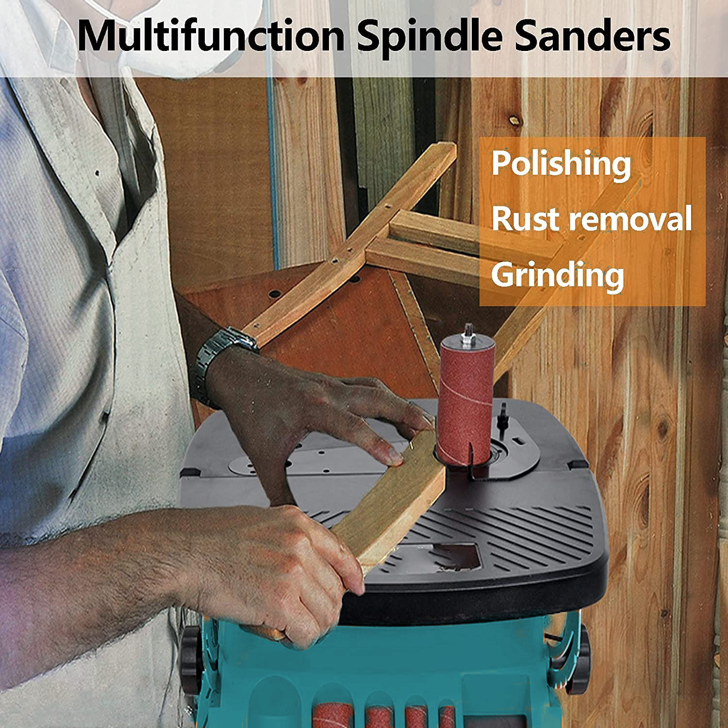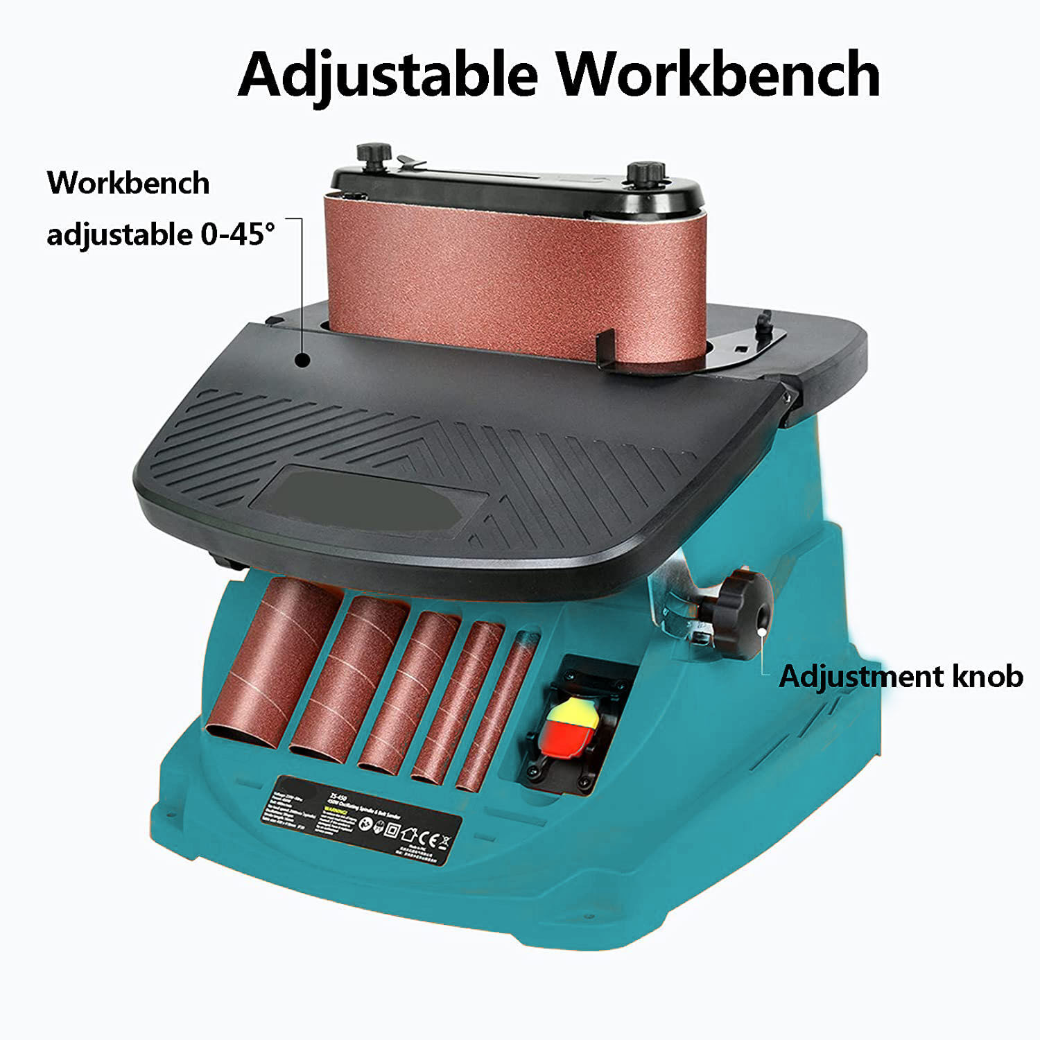 WORKTABLE SURFACE 0-45°ADJUSTABLE: The spindle sanding machine can adjust and polish the table surface at multiple angles by adjusting the knob, which is convenient for straight-line arc polishing.