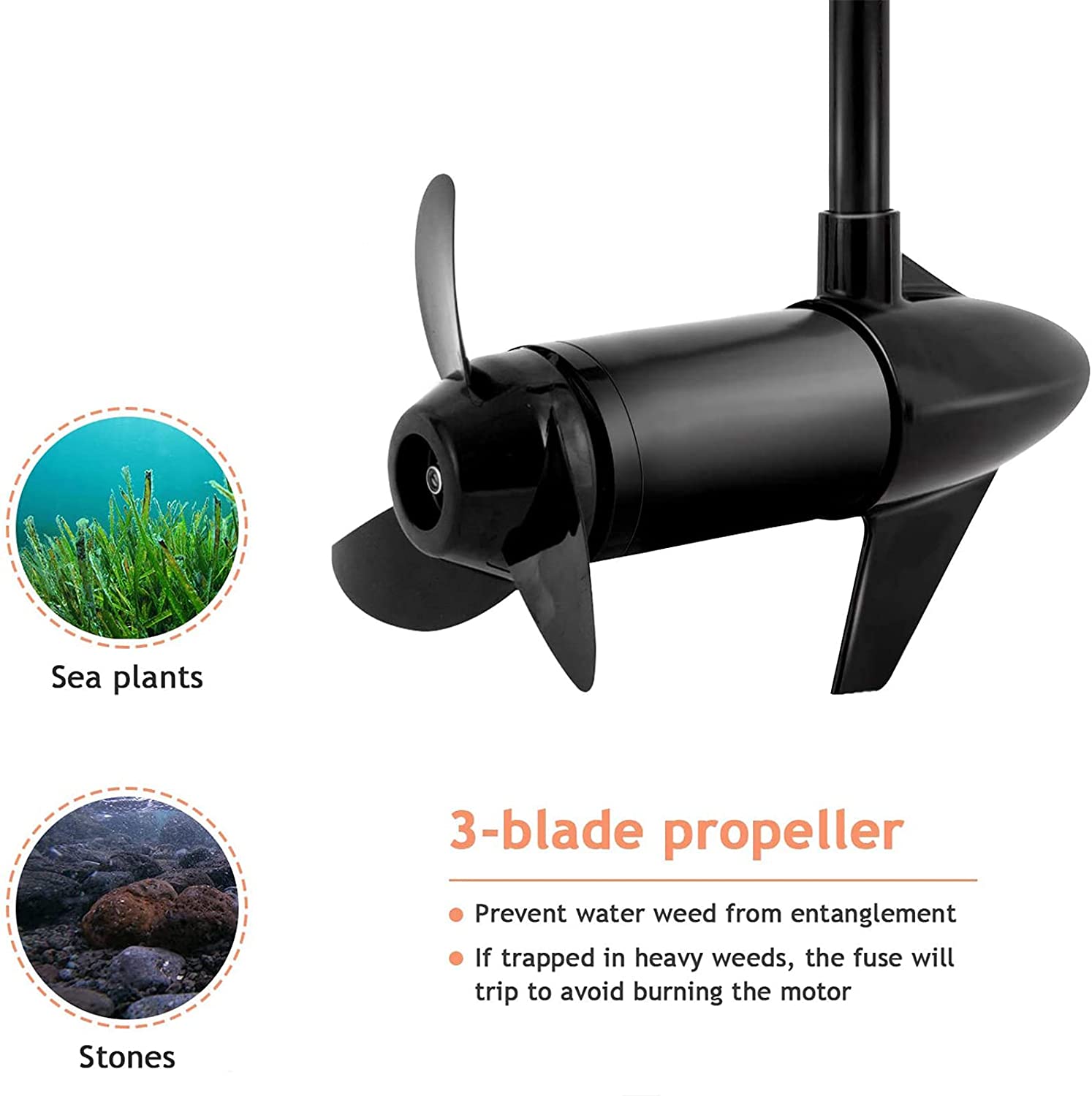 Construcción robusta para uso en agua salada o dulce: El motor eléctrico de arrastre está equipado con una hélice de tres palas, que puede mejorar la motivación y la eficiencia. Tres palas afiladas facilitan la eliminación de algas.
