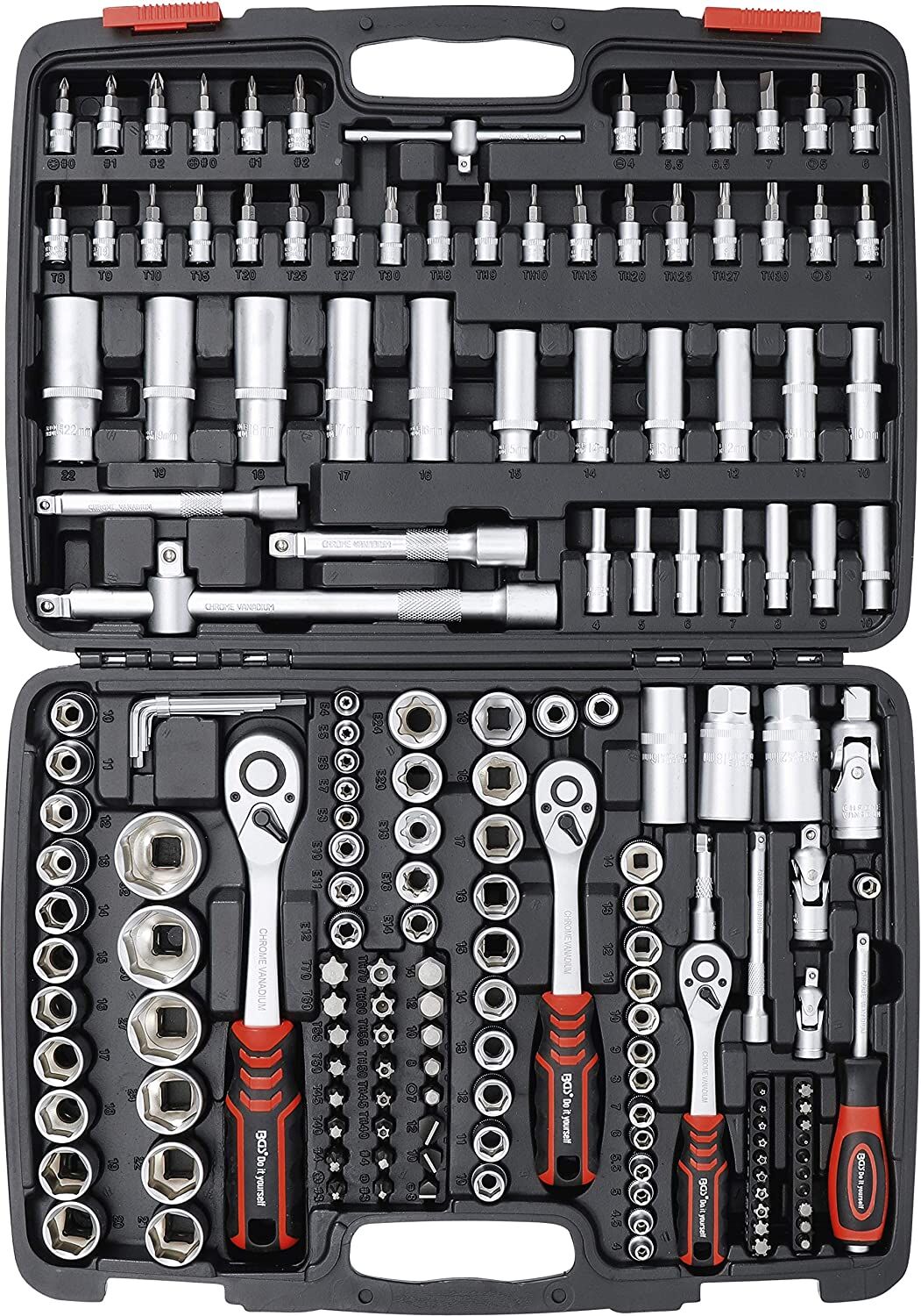 El juego de llaves de vaso 171PCS 1/2", 3/8" y 1/4" (18501711) es un juego de herramientas versátil y completo, que incluye una amplia gama de llaves de vaso, extensiones, trinquetes y puntas en múltiples tamaños de transmisión, diseñados para manejar de manera eficiente un amplio espectro de tareas de fijación y reparación en mantenimiento automotriz y general.