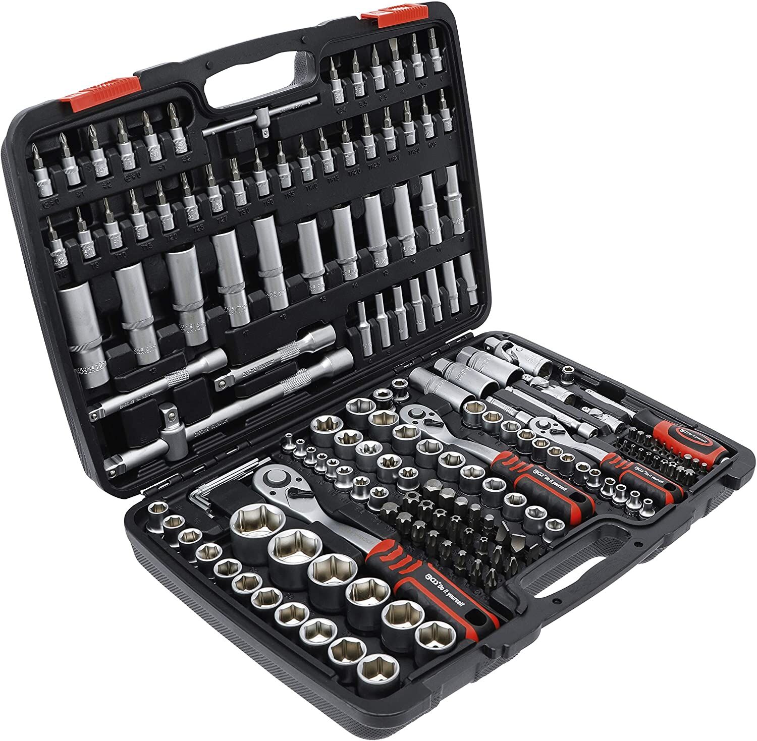 | 1/2" Drive 17pcs 6-point Standard Sockets: 10, 11, 12, 13, 14, 15, 16, 17, 18, 19, 20, 21, 22, 24, 27, 30, 32mm 2pcs E-type Sockets: E20, E24 5pcs 6-point Deep Sockets: 16, 17, 18, 19, 22mm 1pc Quick-release, 72T Ratchet 2pcs Extensions - 125mm, 250mm 1pc Universal Joint 1pc 3 Way Adaptor 2pcs Spark Plug Socket: 16mm, 21mm 1pc Bit Holder 10mm 24pcs 8mm Bits 30mmL TX: 40, 45, 50, 55, 60, 70 TT: 40, 45, 50, 55, 60, 70 PD: 3, 4 PZ: 3, 4 FD: 8, 10, 12mm HEX: 7, 8, 10, 12, 14mm 7pcs Hex Key Wrenches: 1.27, 1.5, 2, 2.5, 3, 4, 5mm 3/8" Drive 10pcs 6-point Standard Sockets: 10, 11, 12, 13, 14, 15, 16, 17, 18, 19mm 6pcs E-type Sockets: E10, E11, E12, E14, E16, E18 6pcs 6-point Deep Sockets: 10, 11, 12, 13, 14, 15mm 1pc Spark Plug Socket: 18mm 1pc Extensions -150mm 1pc Universal Joint 1pc Quick-release, 72T Ratchet 1pc Bit Holder 8mm 1/4" Drive 13pcs 6-point Standard Sockets: 4, 4.5, 5, 5.5, 6, 7, 8, 9, 10, 11, 12, 13, 14mm 5pcs E-type Sockets: E4, 5, 6, 7, 8 7pcs 6-point Deep Sockets: 4, 5, 6, 7, 8, 9, 10mm 1pc Quick-release, 72T Ratchet 2pcs Extensions 50mm, 100mm 1pc Spinner Handle 150mm 1pc Sliding Bar 115mmL 1pc Universal Joint 30pcs Bits Socket H: 3, 4, 5, 6mm FD: 4, 5.5,6.5, 7mm PD: 0,1,2 PZ: 0,1,2 T: 8, 9, 10,15, 20, 25, 27, 30 TT: 8, 9, 10, 15, 20, 25, 27, 30 1pc 1/4"x1/4"bits Holdler 20pcs Bits FD: 6-8, 8-10, 8-10, 10-12mm TX: 10, 15, 20, 25, 27, 30mm PD: 0, 1, 2, 3mm PZ: 1, 2, 3mm S: S1, S2, S3 |