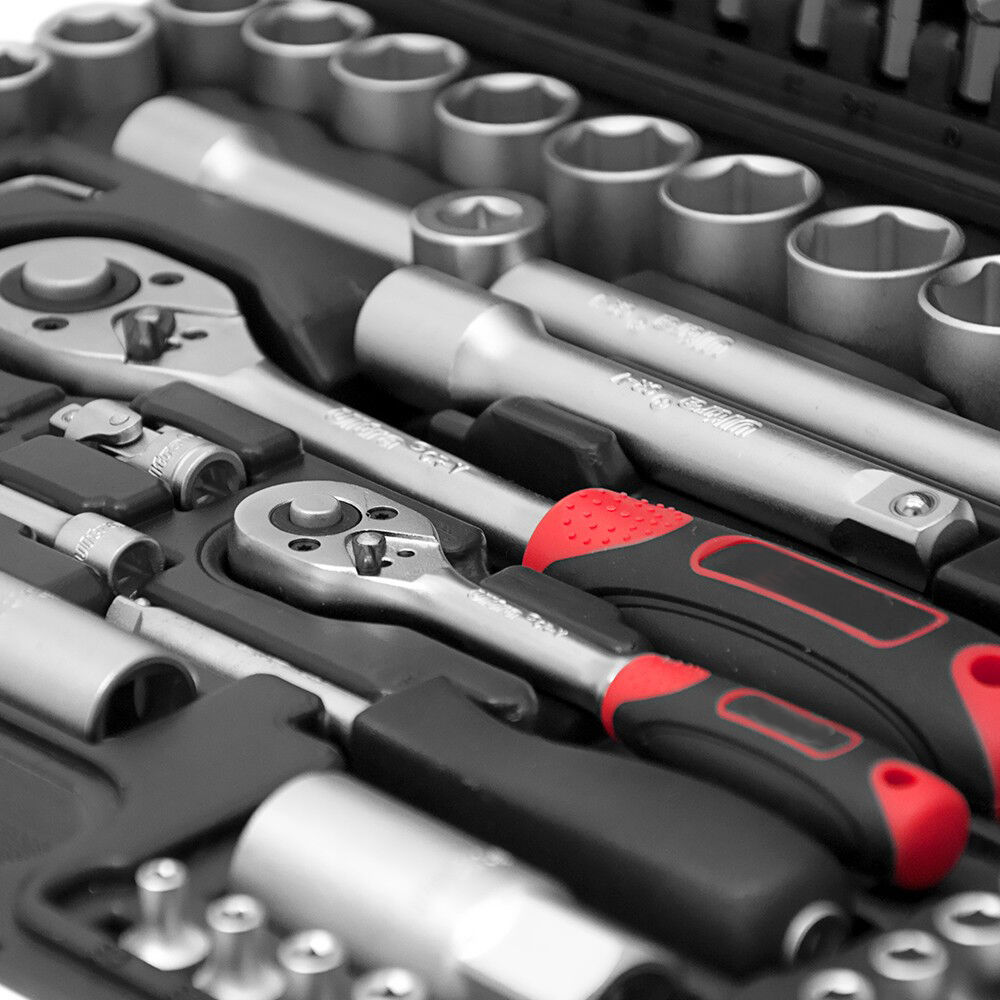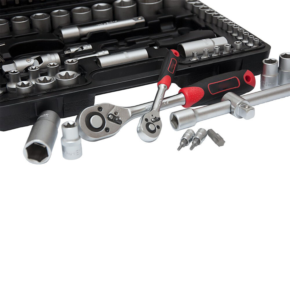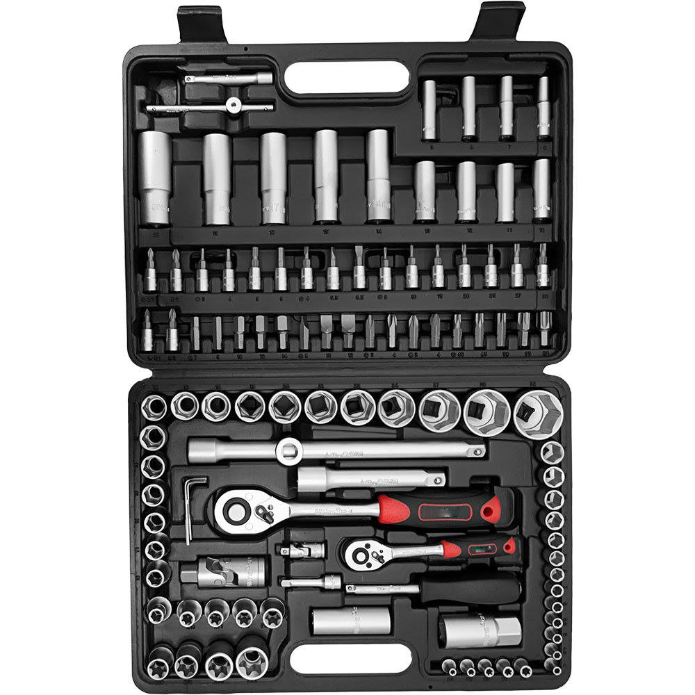 El juego de herramientas mecánicas viene con 94 piezas de herramientas, que satisfacen sus diferentes necesidades, que incluyen enchufe, llave de trinquete, barra de extensión y juego de brocas, etc. Construido en acero de alta aleación y tratado térmicamente para un alto rendimiento. Cromado y pulido espejo. Incluye llave de trinquete reversible de 72 dientes en accionamiento de 1/2 "y 1/4" para una oscilación de arco mínima.