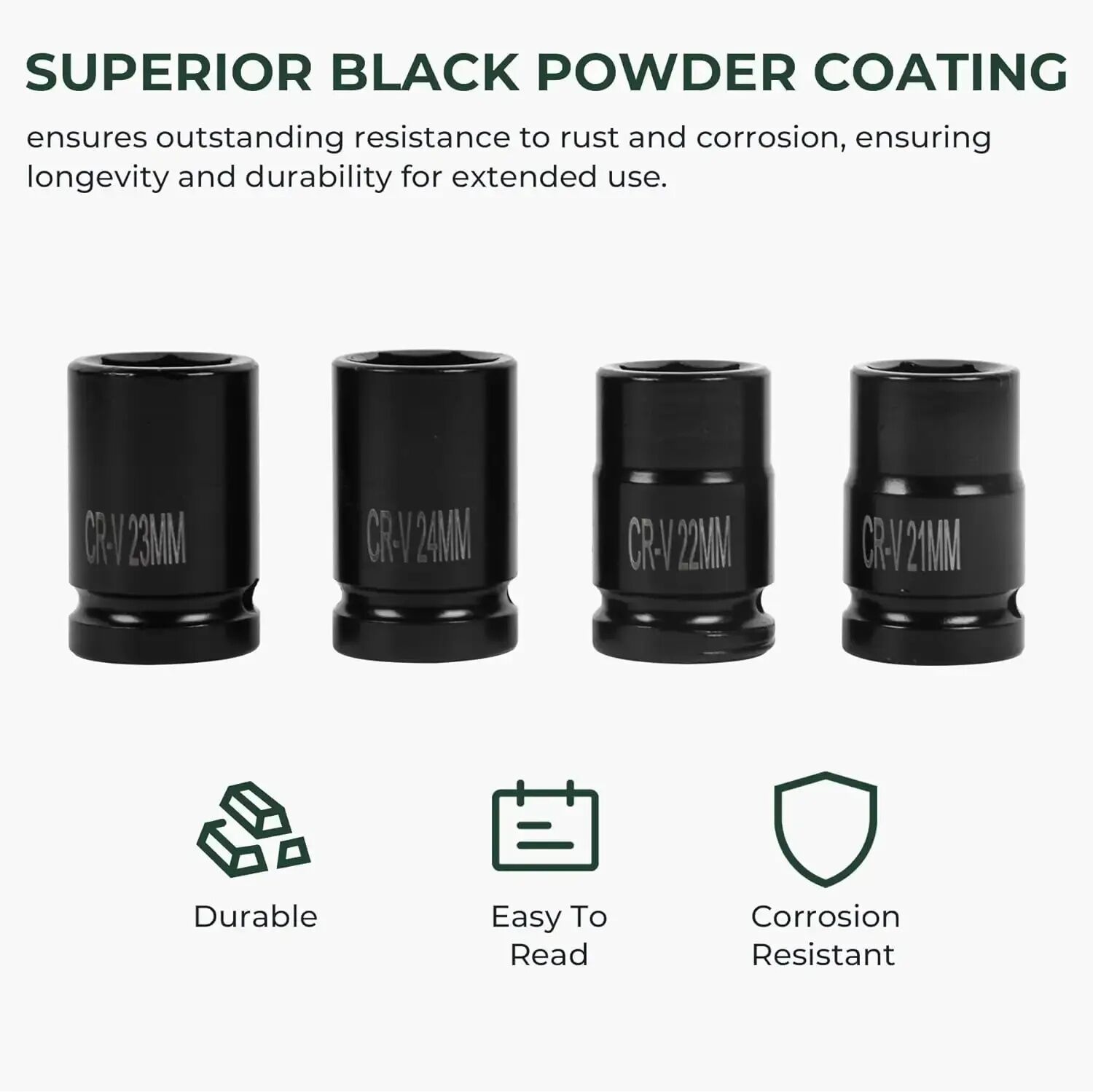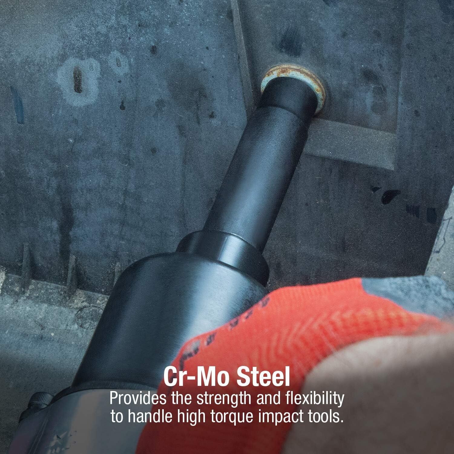 Este juego de vasos de impacto presenta un innovador diseño de pared delgada para acceder a espacios estrechos, lo que aumenta su versatilidad. Fabricado mediante extrusión en frío para mayor densidad y resistencia, resiste la deformación bajo un alto torque. Fabricado con acero especial al cromo-vanadio, forjado en estampa y tratado térmicamente, ofrece dureza, tenacidad, resistencia a la corrosión y al desgaste ideales para una larga vida útil.
