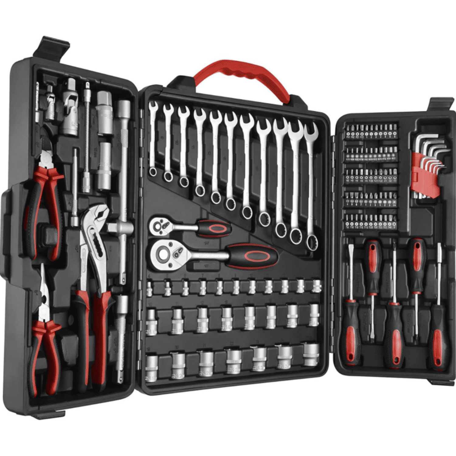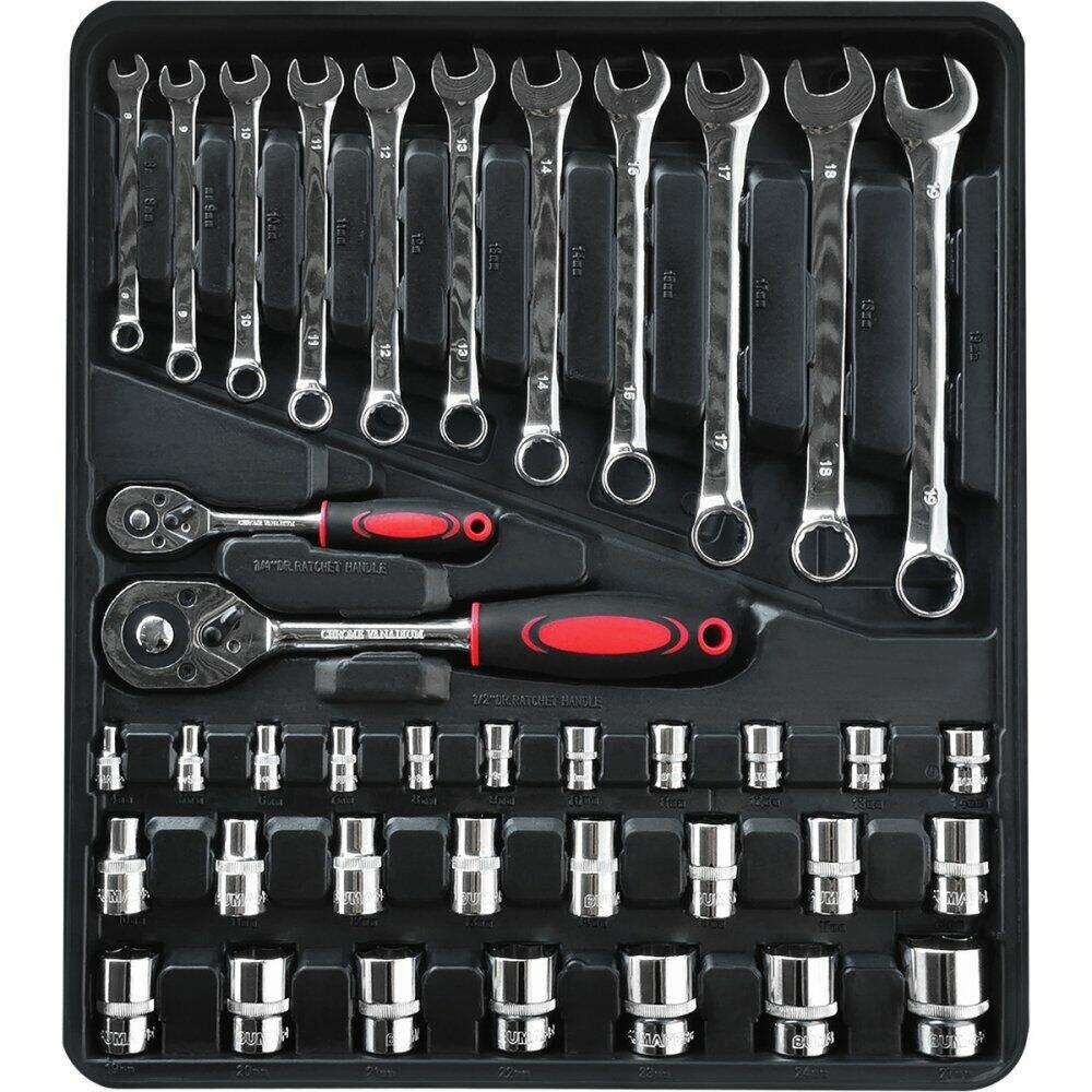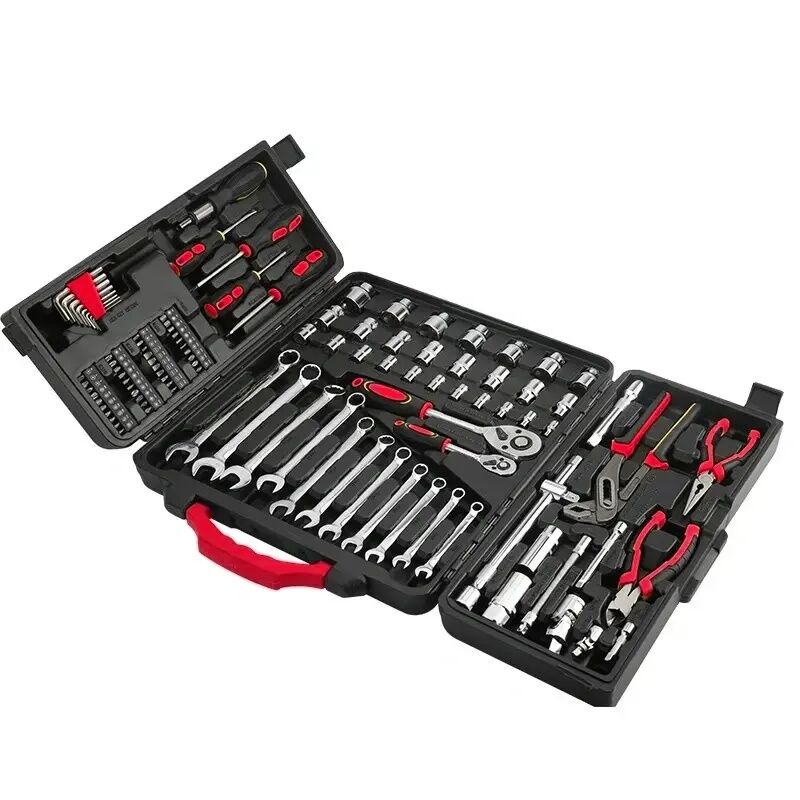| Set Includes: | 1pc 6"longnose plies, 1pc 6"diagonal plies, 1pc 10"groove joint pliers,CS, 4pcs screwdrivers:SL5x75,6x100,PH1x75,PH2x100, 1pc bit holder handle 11pcs combination wrenches:8,9,10,11,12,13,14,15,17,18,19mm,CS 11pcs 1/4dr sockets:4,5,6,7,8,9,10,11,12,13,14 15pcs 1/2dr sockets:10,11,12,13,14,15,17,18,19,20,21,22,23,24,27 1pc 1/4dr universal joint 1pc 1/2dr universal joint 1pc 1/4dr ratchet handle 1pc 1/2dr ratchet handle 2pcs 1/4dr extension bar,50 & 100mm 2pcs 1/2dr extension bar,125 & 250mm 1pc 1/2dr 3-way adaptor 2pcs 1/2dr spark plug sockets:16 & 21mm 1pc flexible extension bar,150mm 8pcs hex key:1.5,2,2.5,3,4,5,5.5,,6, 40pcs bits,25mm |