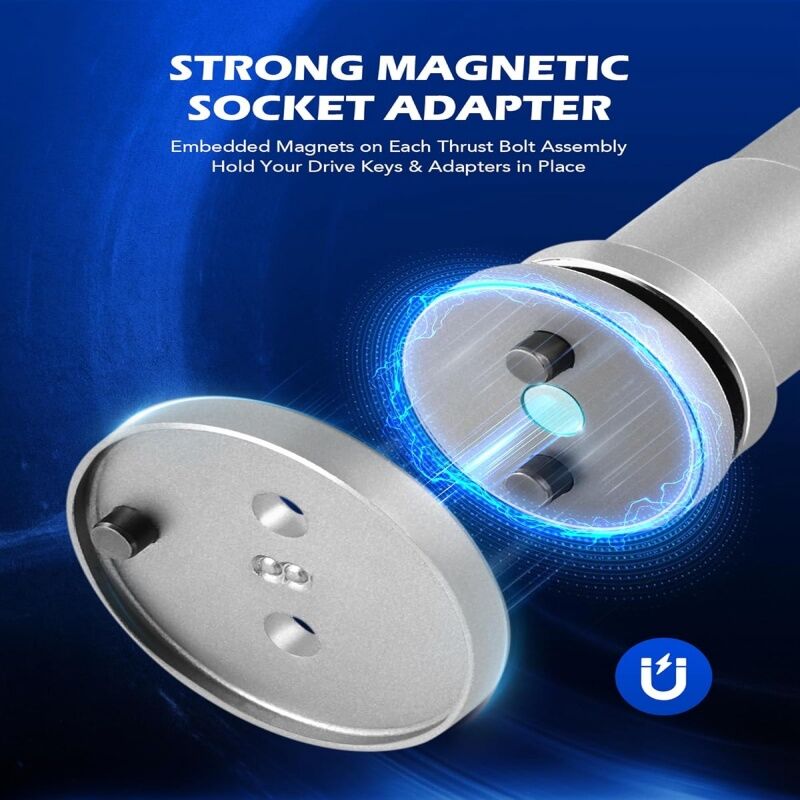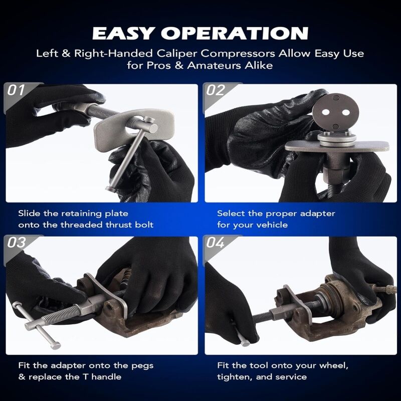 Fácil manejo: Fije la placa al mango, seleccione el adaptador de disco adecuado y gire los pistones para retraerlos en las pinzas y liberar las pastillas de freno; los imanes integrados en cada conjunto de perno de empuje sujetan firmemente las llaves y los adaptadores durante el uso.