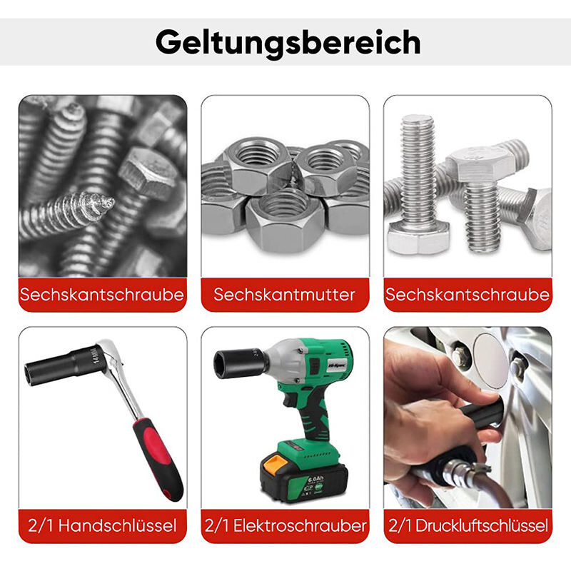 Gran compatibilidad: El adaptador de 3/4" x 1/2" permite que el juego funcione con herramientas de diferentes tamaños de accionamiento, ampliando su uso con otros equipos sin necesidad de juegos adicionales.