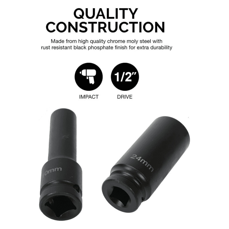 Proceso de alta precisión: El vaso métrico de alto torque con diseño de 6 puntos y acople de 1/2 pulgada garantiza una conexión firme, evitando el redondeo de las esquinas y el desprendimiento de los pernos, lo que reduce el daño a la tuerca del eje y garantiza un trabajo impecable.