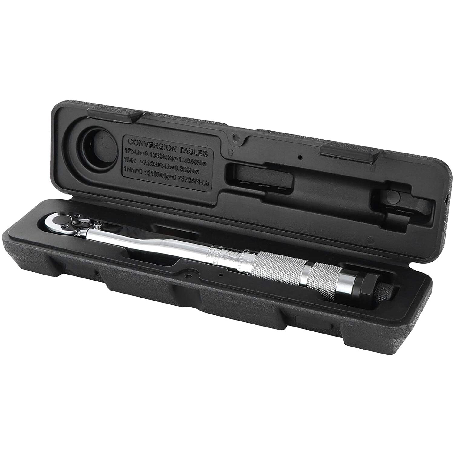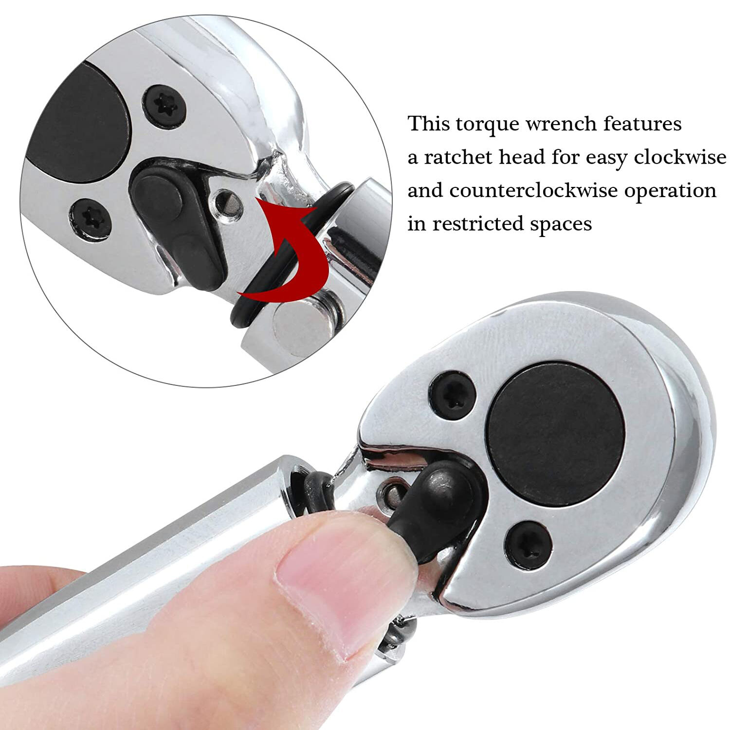 Material de alta calidad: Construcción íntegramente en acero al cromo vanadio con cabezal de trinquete reversible y recubrimiento de cromo plateado con chorro de arena. Es duradera y antioxidante. Escala de doble rango de alto contraste. Le permite apretar sujetadores con confianza según especificaciones precisas, asegurando que las piezas estén bien sujetas sin dañarlas.