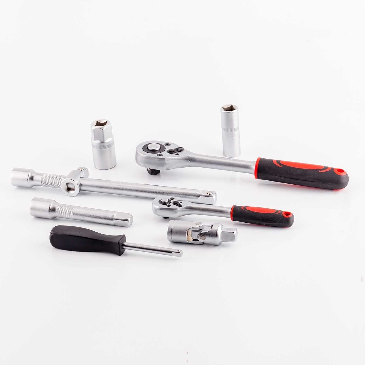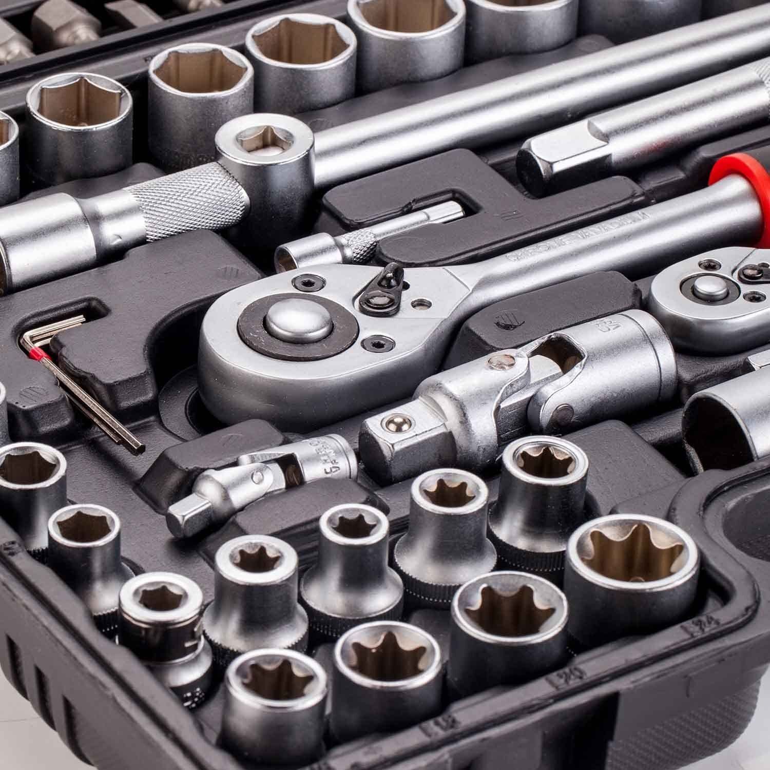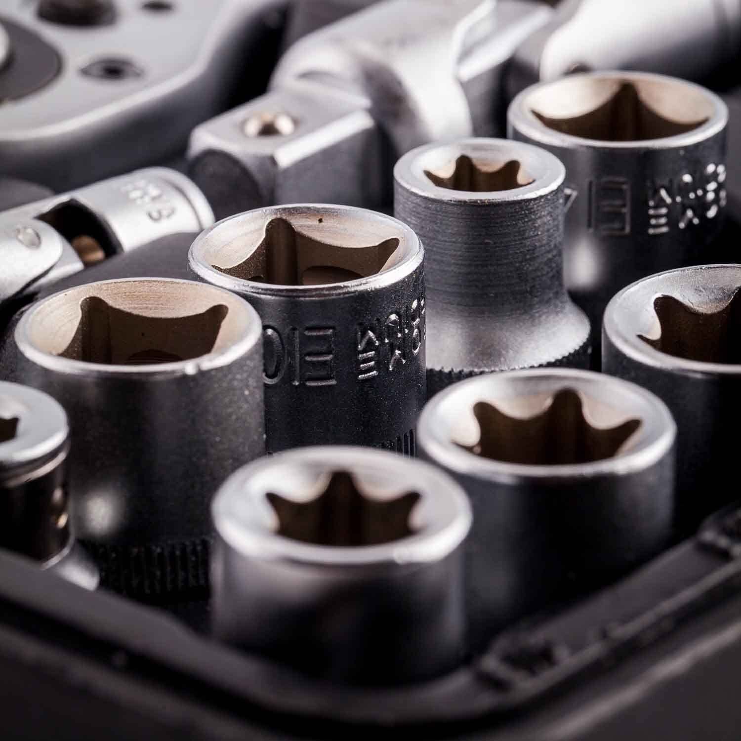 | 18PCS-1/4"DR.BIT SOCKETS:FD4,5.5,6.5PH1,2.PZ1,2.HW3,4,5,6.T8,10,15,20,25,27,30 17PCS-BITS(30L):SL8,10,12.T40,45,50,55,60.PH3,4.PZ3,4.HEX7,8,10,12,14. 17PCS-1/2"DR.SOCKETS:10,11,12,13,14,15,16,17,18,19,20,21,22,24,27,30,32MM 13PCS-1/4"DR SOCKETS:4,4.5,5,5.5,6,7,8,9,10,11,12,13,14MM 8PCS-1/2"DR TORX SOCKETS:E10,E11,E12,E14,E16,E18,E20,E24MM 5PCS-1/4"DR TORX SOCKETS:E4,E5,E6,E7,E8 8PCS-1/4"DR DEEP SOCKETS:6,7,8,9,10,11,12,13MM 5PCS-1/2"DR DEEP SOCKETS:14,15,17,19,22MM 2PCS-1/2"DR EXTENSION BARS5"&10" 2PCS-1/4"DR EXTENSION BARS2"&3" 2PCS-1/2"SPARK PLUG SOCKETS:16MM&21MM 2PCS-1/4"&1/2"DR.UNIVERSAL JOINT 2PCS-1/4"&1/2"QUICK RATCHET HANDLE 3PCS-HEX KEY WRENCHES:1.5,2,2.5MM 1PCS-1/2"DR.3-WAY ADAPTOR 1PCS-1/4"DR.SLIDING T BAR 1PCS-1/4"DR.SPINNER HANDLE:6" 1PCS-1/2"DR.BIT HOLDER 1PCS-BLOW CASE |