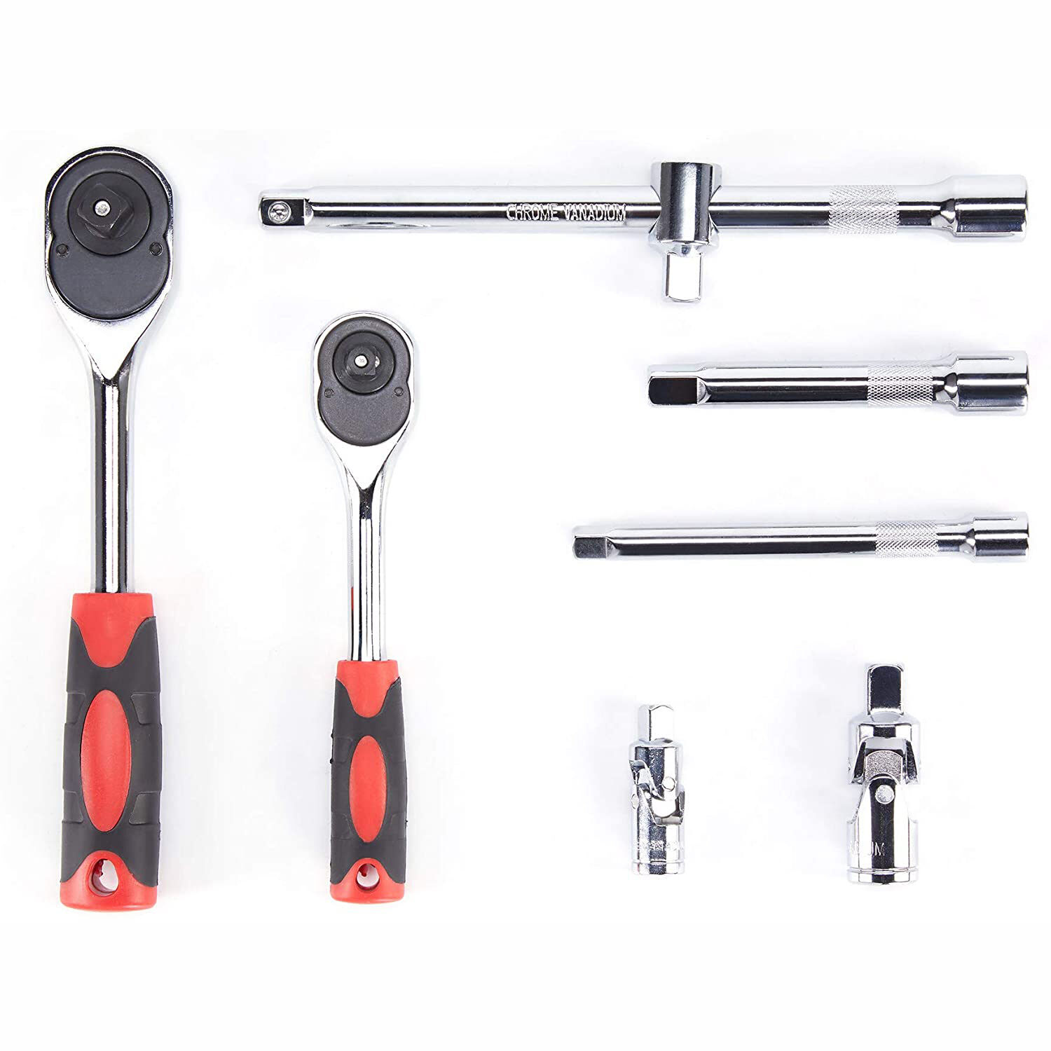 Kit todo en uno: Este kit de herramientas para reparaciones domésticas y automotrices incluye mangos de trinquete de 1/4", 3/8" y 1/2", un mango de llave de 1/4", un destornillador de cabeza ajustable y 7 llaves Allen; incluye juntas universales y barras deslizantes para mayor alcance.