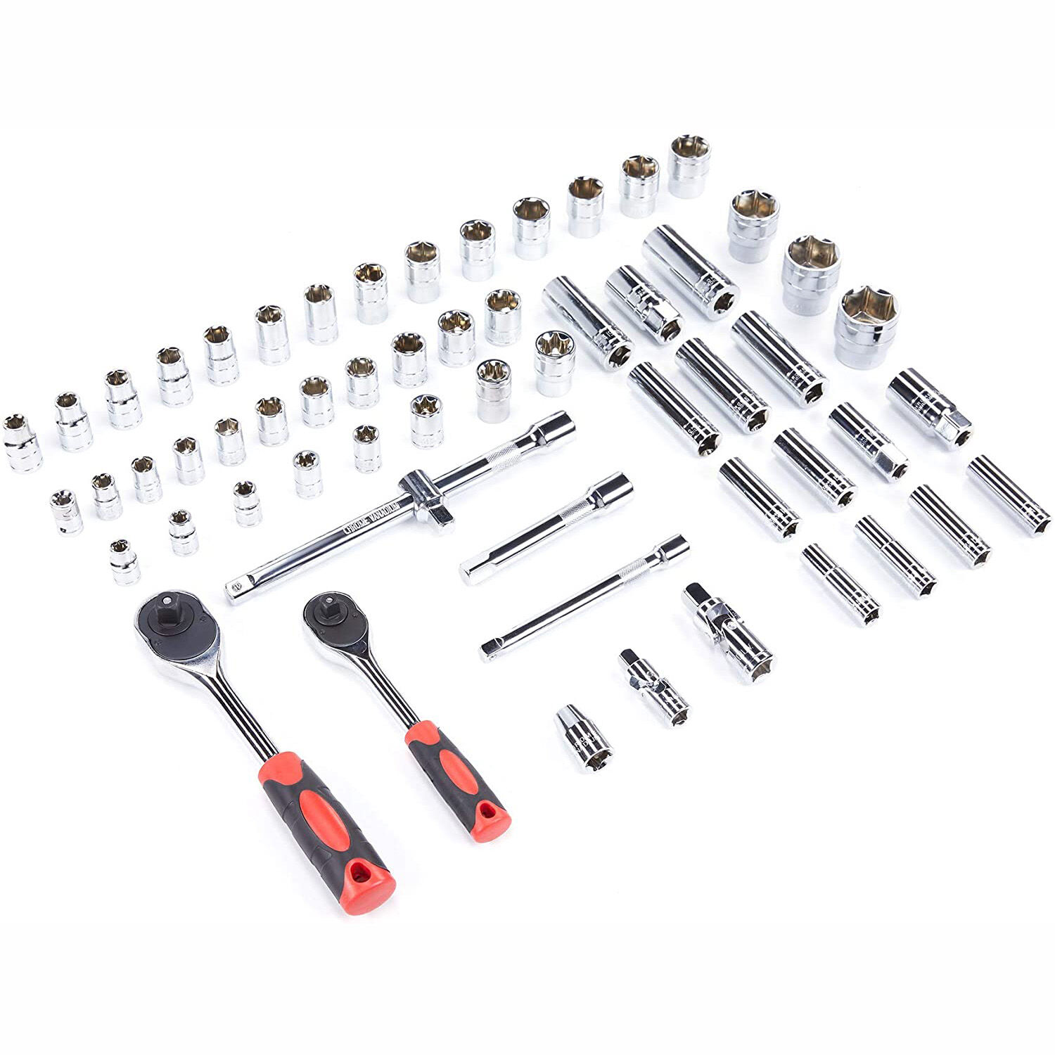 Material superior: Este juego de llave y trinquete está fabricado en acero al cromo vanadio resistente a la corrosión para un torque, resistencia y durabilidad superiores, e incluye agarres de goma para un manejo antideslizante. Estuche práctico: el estuche moldeado por soplado con cerradura del kit de herramientas permite guardarlo y transportarlo fácilmente.