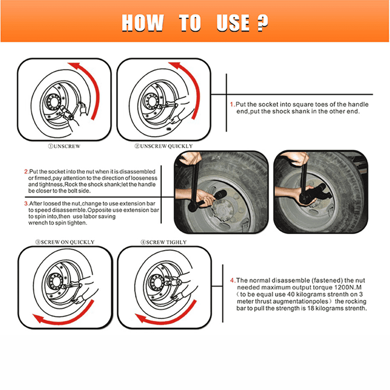 Fácil de usar: Retire las tapas de las tuercas y coloque el dado correcto en la tuerca. Conecte la llave de vaso al dado y ancle la varilla de refuerzo contra el cubo de la rueda o una tuerca adyacente para asegurar un funcionamiento estable y apalancamiento. Coloque el mango y gire en la dirección en que desee mover la tuerca; la barra de extensión ayuda a retirar las tuercas rápidamente después de aflojarlas. Use el dado cuadrado para pernos de doble espárrago cuadrados.