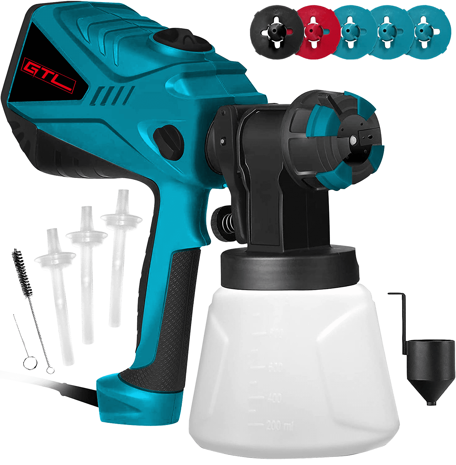 Control de flujo ajustable: La perilla de control de flujo permite regular la salida de pintura para diferentes necesidades de pintura, incluyendo bordes, esquinas y superficies amplias. Las boquillas de cobre garantizan una pulverización más uniforme y reducen la probabilidad de obstrucciones.