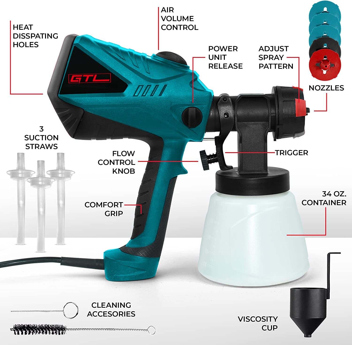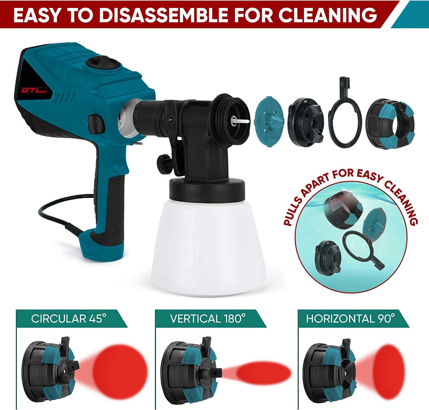 Diseño perfecto para la experiencia del usuario: La pistola de pintura es desmontable, lo que facilita su uso y limpieza. Además, cuenta con un cable de alimentación largo que proporciona libertad de movimiento en un espacio de trabajo más amplio.