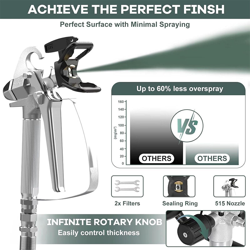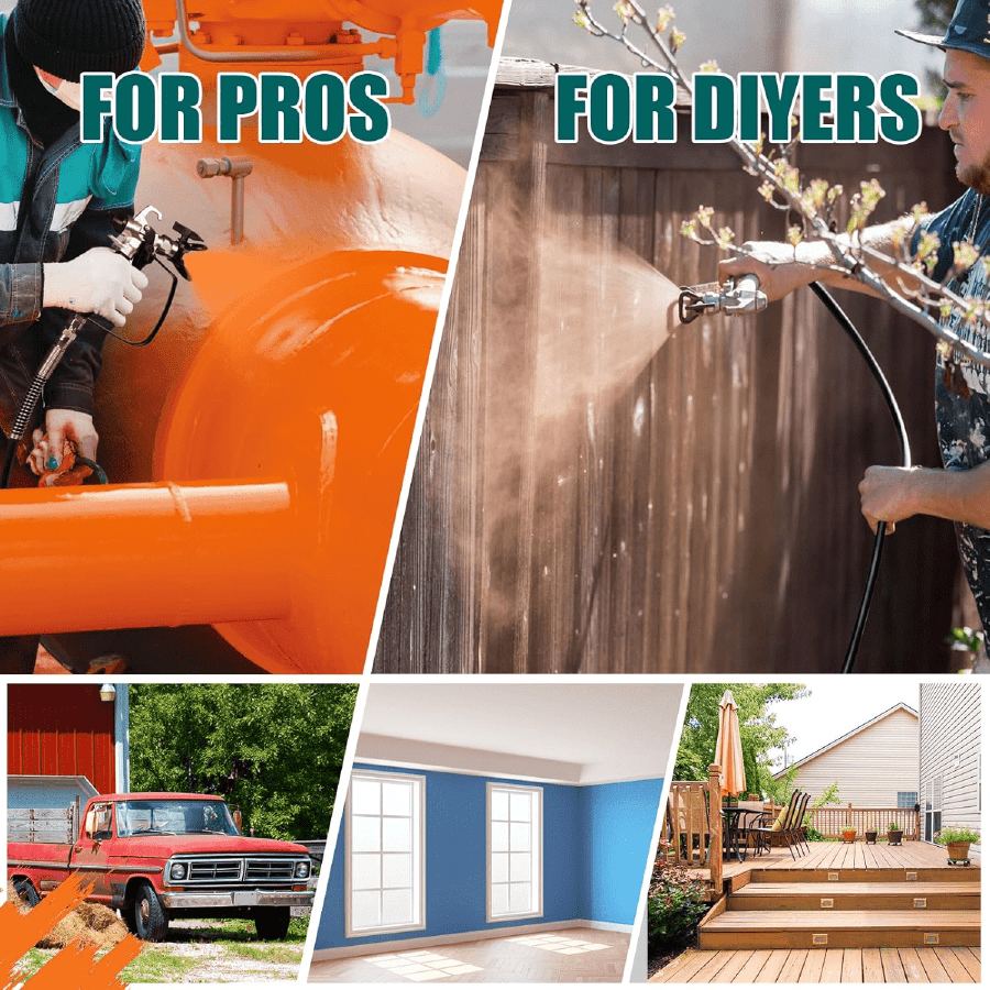 Pinte como un profesional: Las máquinas de pintura están equipadas con boquillas de pulverización de calidad profesional para un patrón de pulverización más suave y una pulverización mínima, lo que reduce el desperdicio de material. Pulverización por atomización real, sin marcas de brocha ni punteado de rodillo. Eleve sus proyectos de interior a un nivel profesional.