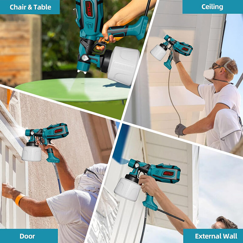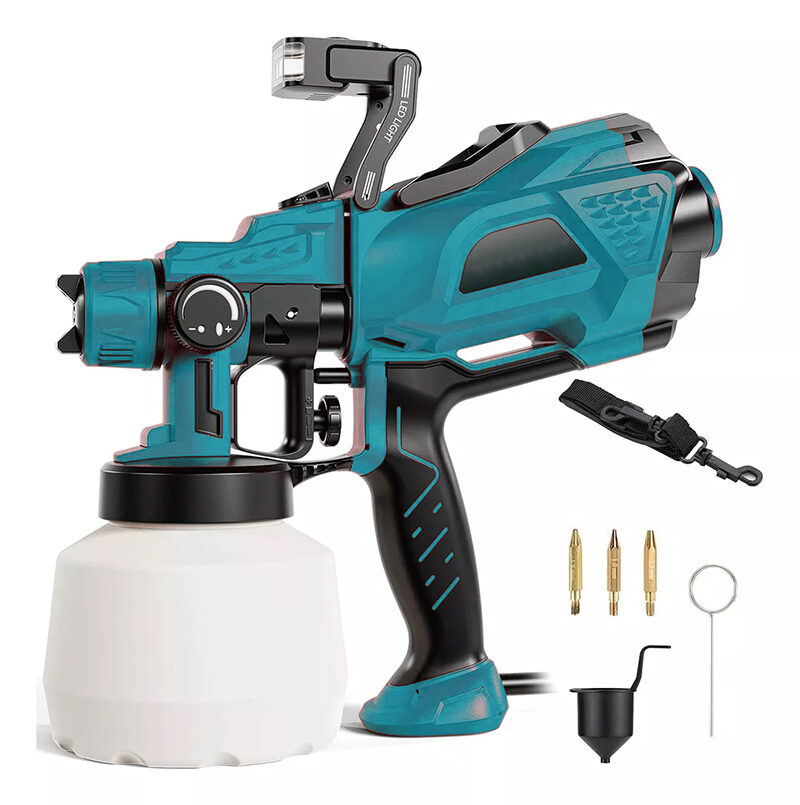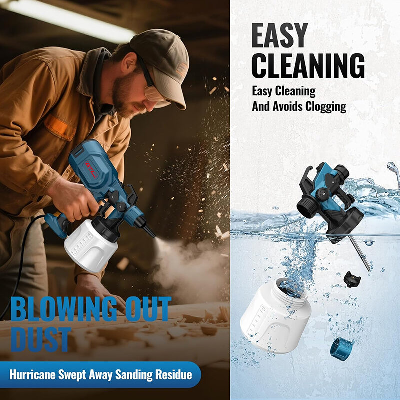 El pulverizador de pintura sin aire está equipado con una pistola eléctrica HVLP (pulverización más eficiente), lo que garantiza una pulverización más eficiente. Gracias a un motor de alta velocidad de 550 W y un robusto turboventilador, ofrece resultados de pintura más rápidos y uniformes. Su depósito de gran capacidad (1400 ml) aumenta aún más la comodidad, haciéndolo ideal para proyectos como pintar muebles, vallas, armarios o paredes.