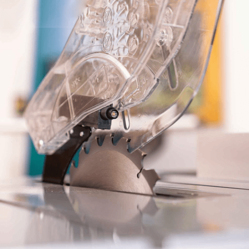 The table saw has a transparent blade guard: which can provide a clear view and prevent hurt due to accidental touch. And it also comes with a push stick to enhance security during operation. Furthermore, On-off switch and overload protection are equipped for added safety.