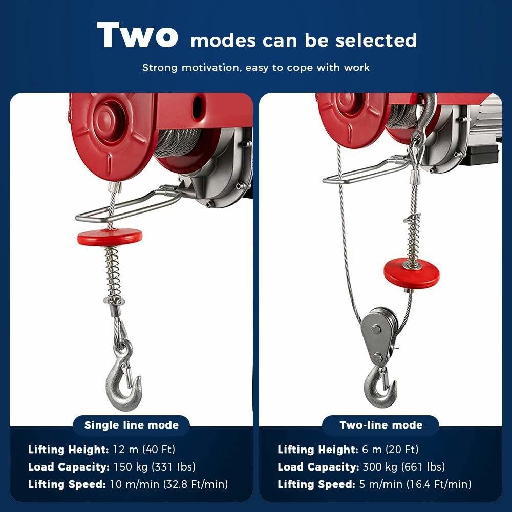 This lift electric hoist is designed for lifting and moving heavy-duty applications. The steel construction and pure copper motor make it durable and high-efficient. The hoist can be used with a single line 1100 lbs/500 kg capacity or double lines 2200 lbs/1000 kg capacity. It is an ideal handling tool for factories, docks, warehouses, goods lifting, construction sites, and other places.