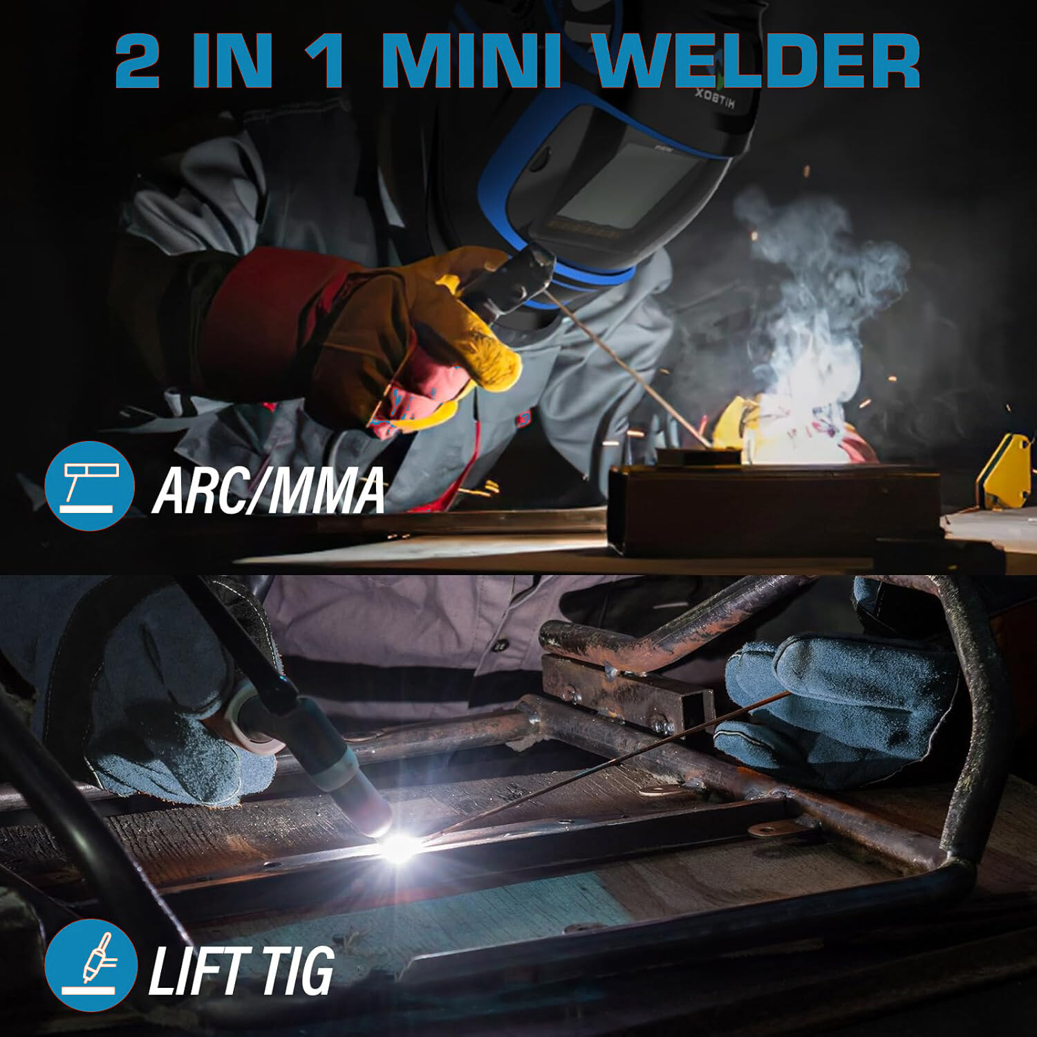 2 in 1 arc welding machine supports mma welding and lift tig(Press knob 5 seconds), with a synergistic function that automatically matches the thickness of the workpiece and size of rods by adjust welding current.