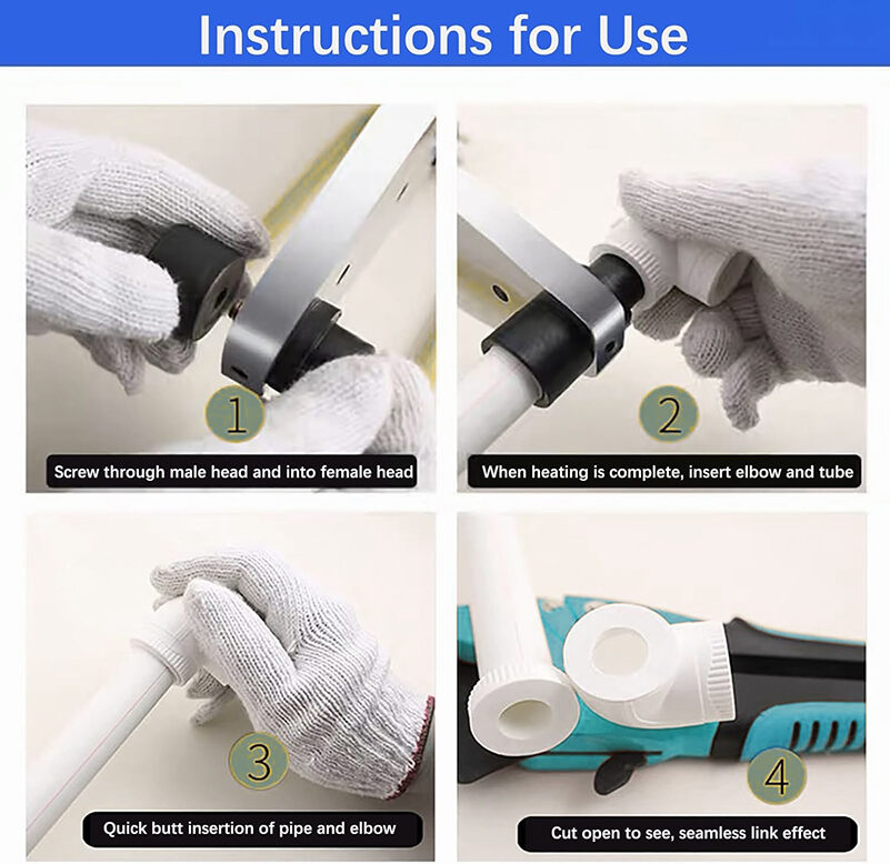 1.6 DIE HEAD: Suitable For Pipes Diameter 0.79"(20mm)/0.98"(25mm)/1.26"(32mm)/1.58"(40mm)/1.97"(50mm)/2.48"(63mm) can be welded to PPR, Pb, PE, PV, plastic and other materials, suitable for home, repair workshop or construction site.